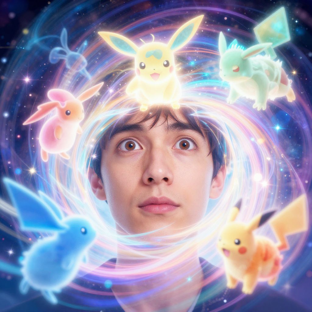 Photograph-style digital artwork featuring a young Asian man with short black hair and wide, surprised brown eyes. He has a fair complexion and is centered in the image. Surrounding his head is a glowing, swirling vortex of bright white and blue light, creating a magical effect. Floating within the vortex are several colorful, glowing Pokémon-like creatures, including a yellow Pikachu, a blue Eevee, a pink Pichu, and a green Chikorita. The background is a dark, starry space, enhancing the ethereal, otherworldly atmosphere. The man's expression is one of wonder and slight bewilderment.