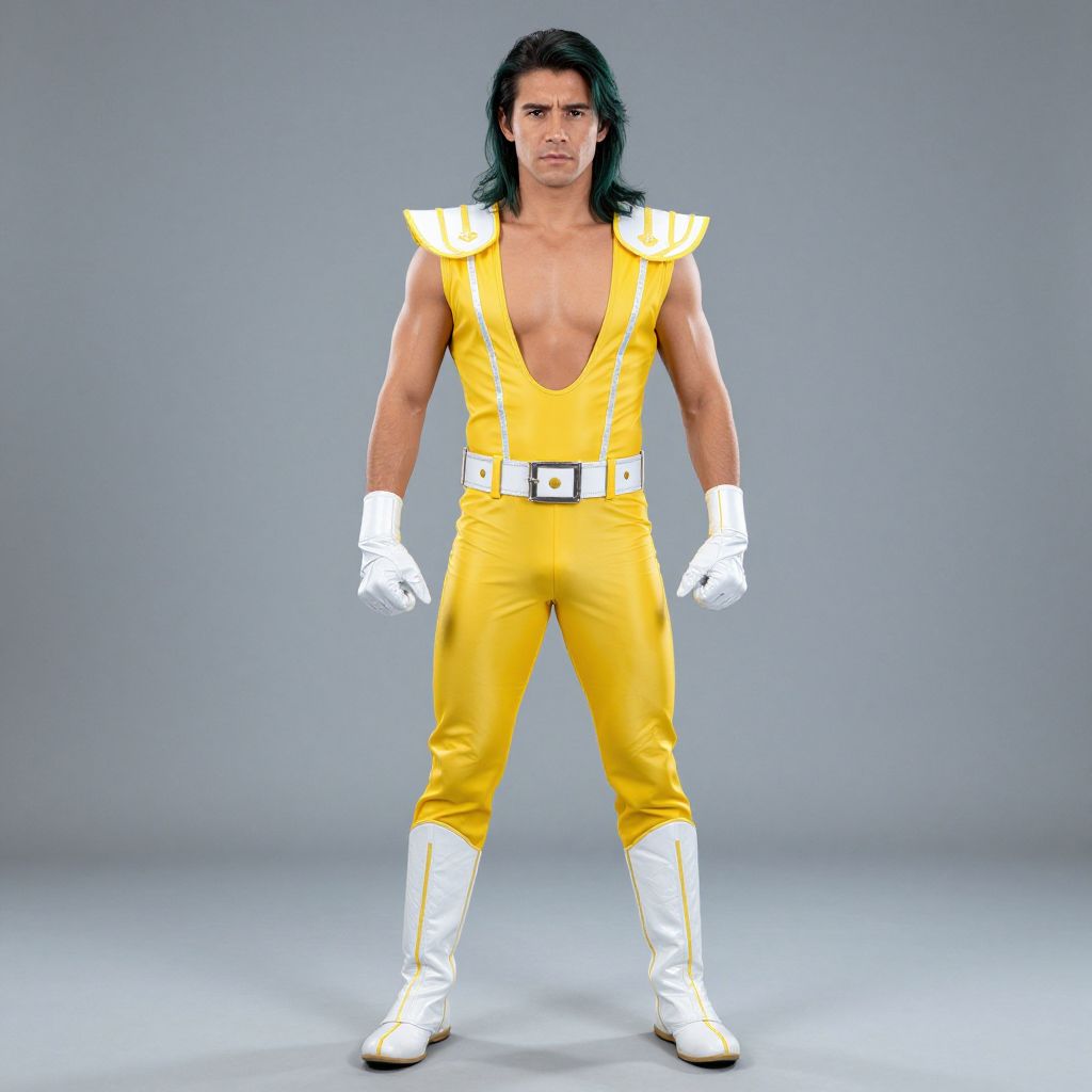 Adult luchador costume, solo, male focus, 1boy, gloves, yellow pants, white gloves, standing, belt, boots, jumpsuit, green hair, full body, looking at viewer, long hair, pants