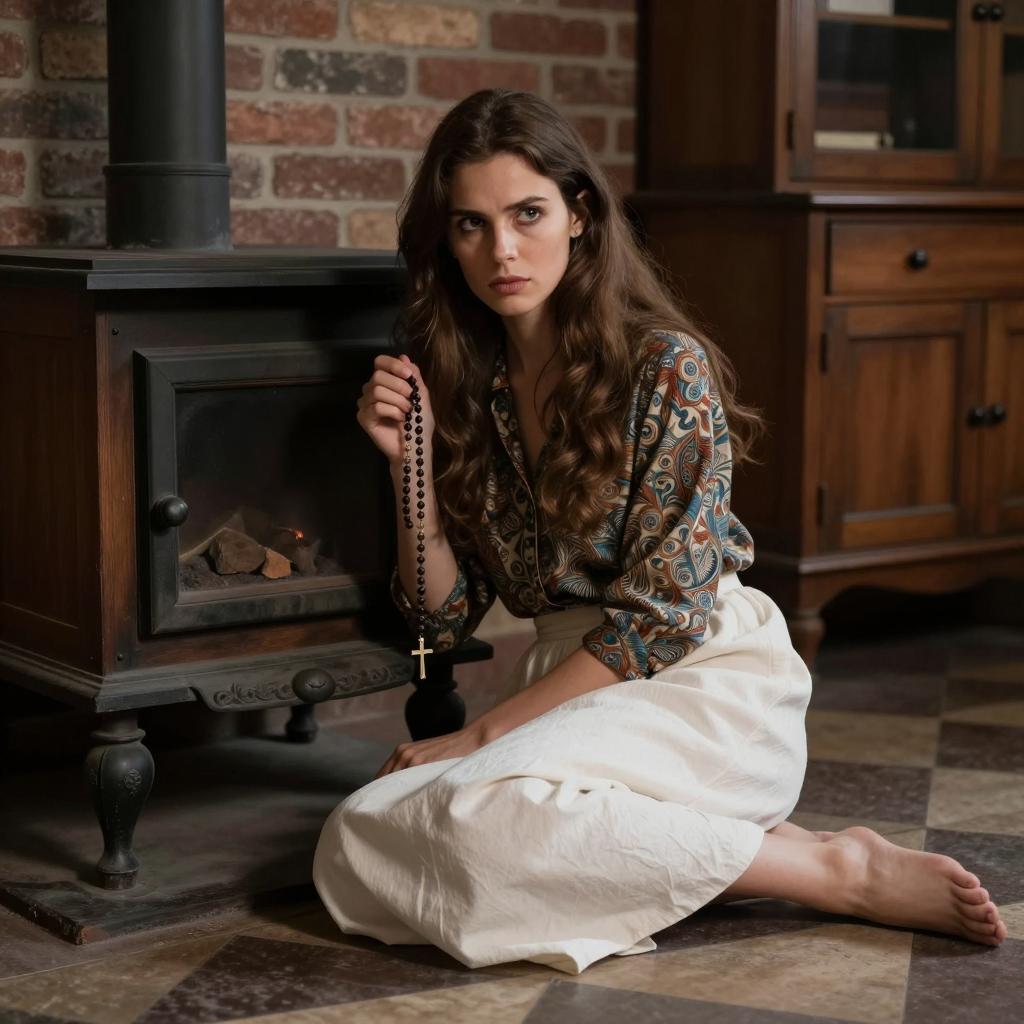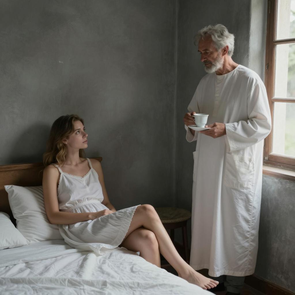 Two people in a dimly lit room. A young woman with light brown hair in a white dress sits on a stool beside a bed with white sheets, legs crossed. An older man with gray hair in a white robe stands near a window, holding a cup and saucer. The room has rough, gray walls.
