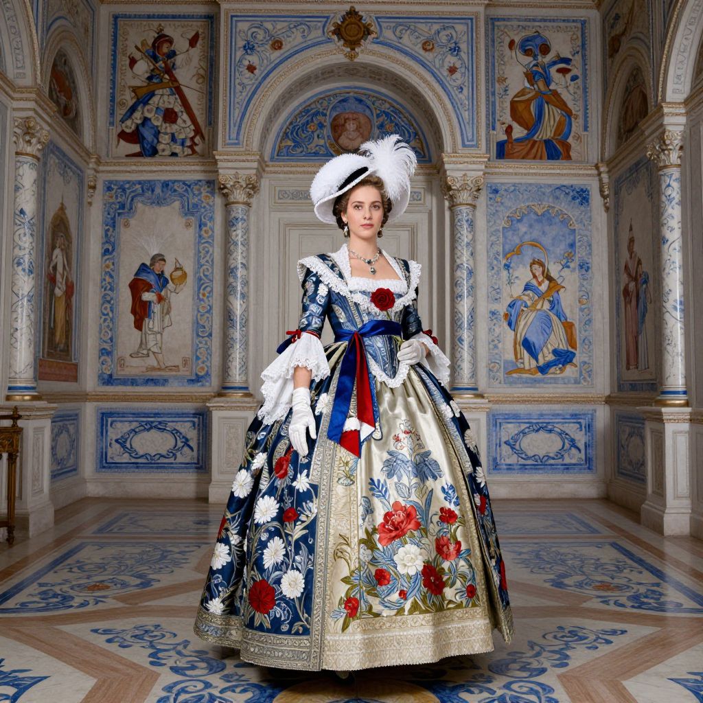 The image depicts a woman dressed in an elaborate, traditional Portuguese fresco-style gown, standing in a grand, ornate room adorned with blue and white floral patterns. The gown features intricate floral designs in red and white, with a blue sash and a red rose held in her hand. The woman's attire is complemented by a white, lace-trimmed bodice and a large, voluminous skirt. She is wearing a white, feathered hat and white gloves, adding to the regal and historical ambiance of the scene. The room itself is richly decorated with columns, arches, and detailed wall frescoes, creating a sense of depth and grandeur. The overall composition is balanced, with the woman centrally positioned, surrounded by the elaborate architectural elements and vibrant patterns, creating a harmonious and visually striking image.