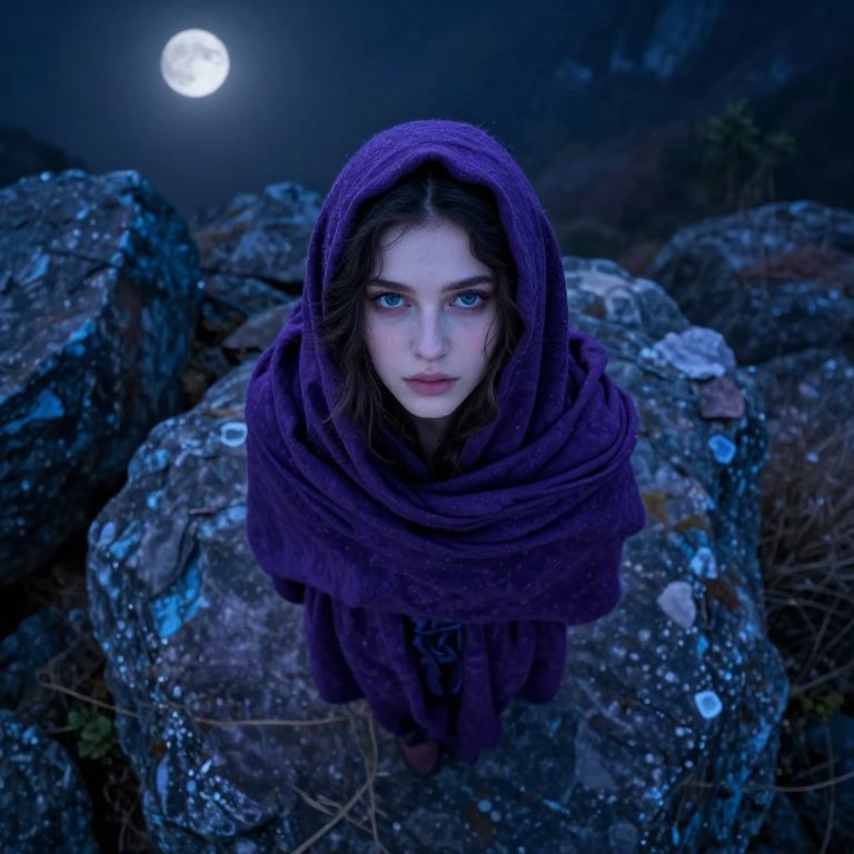 A portrait photograph captures an enigmatic Middle Eastern woman with porcelain skin and piercing blue eyes. Her gaze, a blend of wisdom and intrigue, rests upon the towering snow-capped mountains beneath the twilight sky. Soft moonlight bathes her delicate features in a gentle glow, elongating shadows that accentuate the sculpted contours of her face and intricate braided hair adorned with frosty crystal jewelry. This ultrarealistic image evokes resilience and solitude from a unique aerial perspective, soaring above the rugged landscape. The emotional gradient ranges from serene tranquility to profound introspection, inviting viewers on a journey through her captivating world.