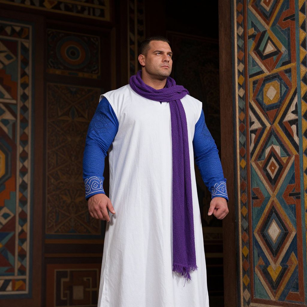 A tall, muscular man with a strong, athletic build, wearing a long white robe with intricate blue sleeves and a flowing purple scarf wrapped around his neck. He is standing confidently in front of a wall adorned with a complex, patterned design that features geometric shapes and vibrant colors. The man's intense gaze is directed towards the wall, exuding a sense of authority and mystery. The overall scene is set in a grand, dimly lit room with soft ambient lighting that enhances the mystical atmosphere.