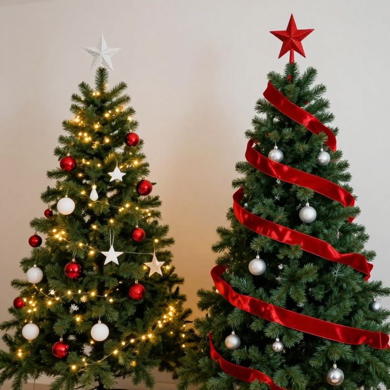 Two beautifully decorated Christmas trees stand side by side, showcasing distinct styles: one adorned with warm lights, red and white ornaments, and star-shaped decorations, while the other features bold red ribbons spiraling around its branches, complemented by silver baubles and a festive red star topper.