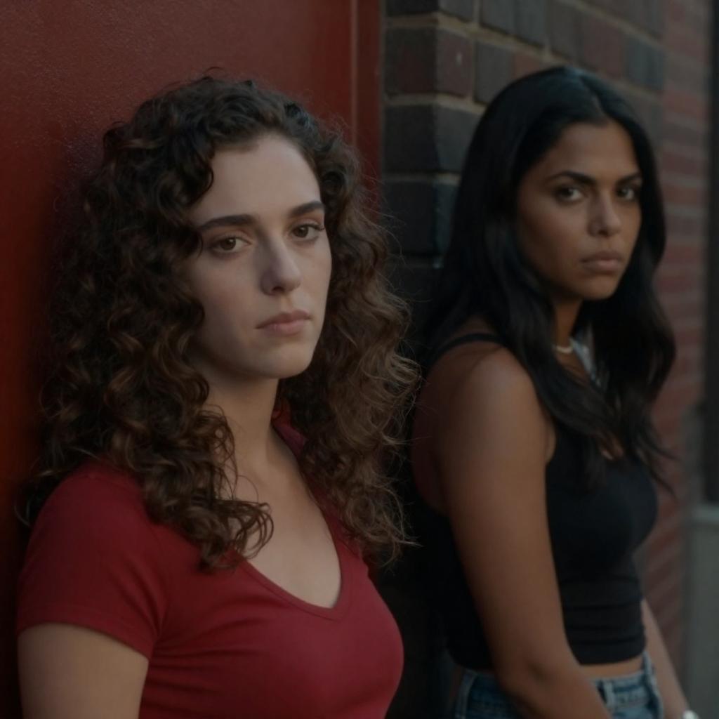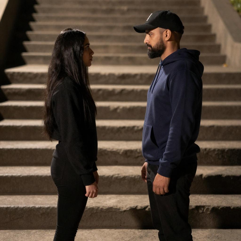 Two women fighting outdoors at night. The woman on the left has long black hair, wears an orange jacket and black pants, with a frightened expression. The woman on the right has curly hair, wears a black jacket and black pants, and holds a knife. They are on a wet concrete patio beside a pool, with a wooden fence and house in the background.