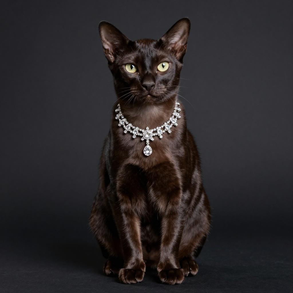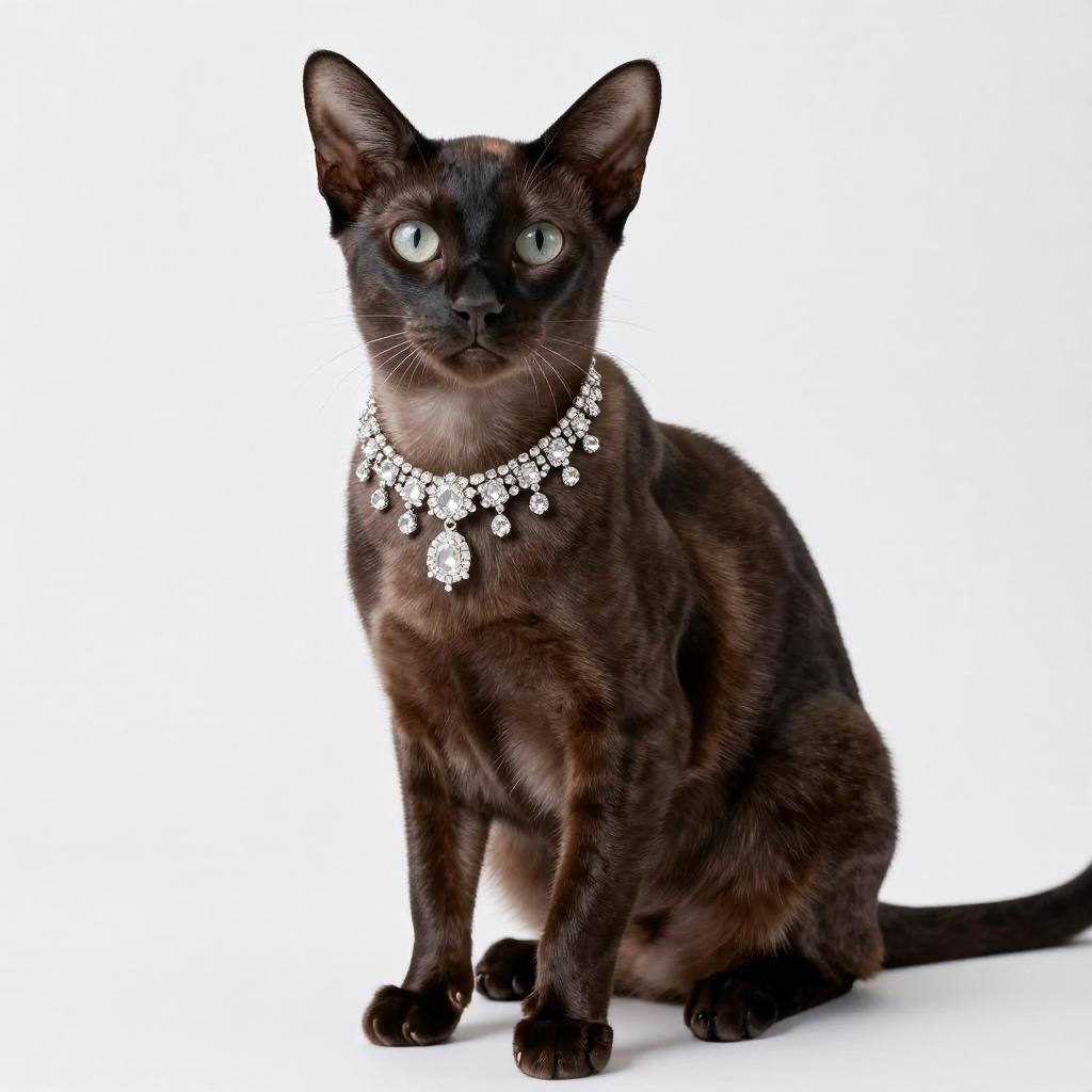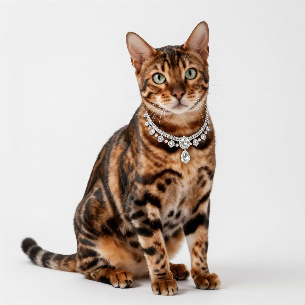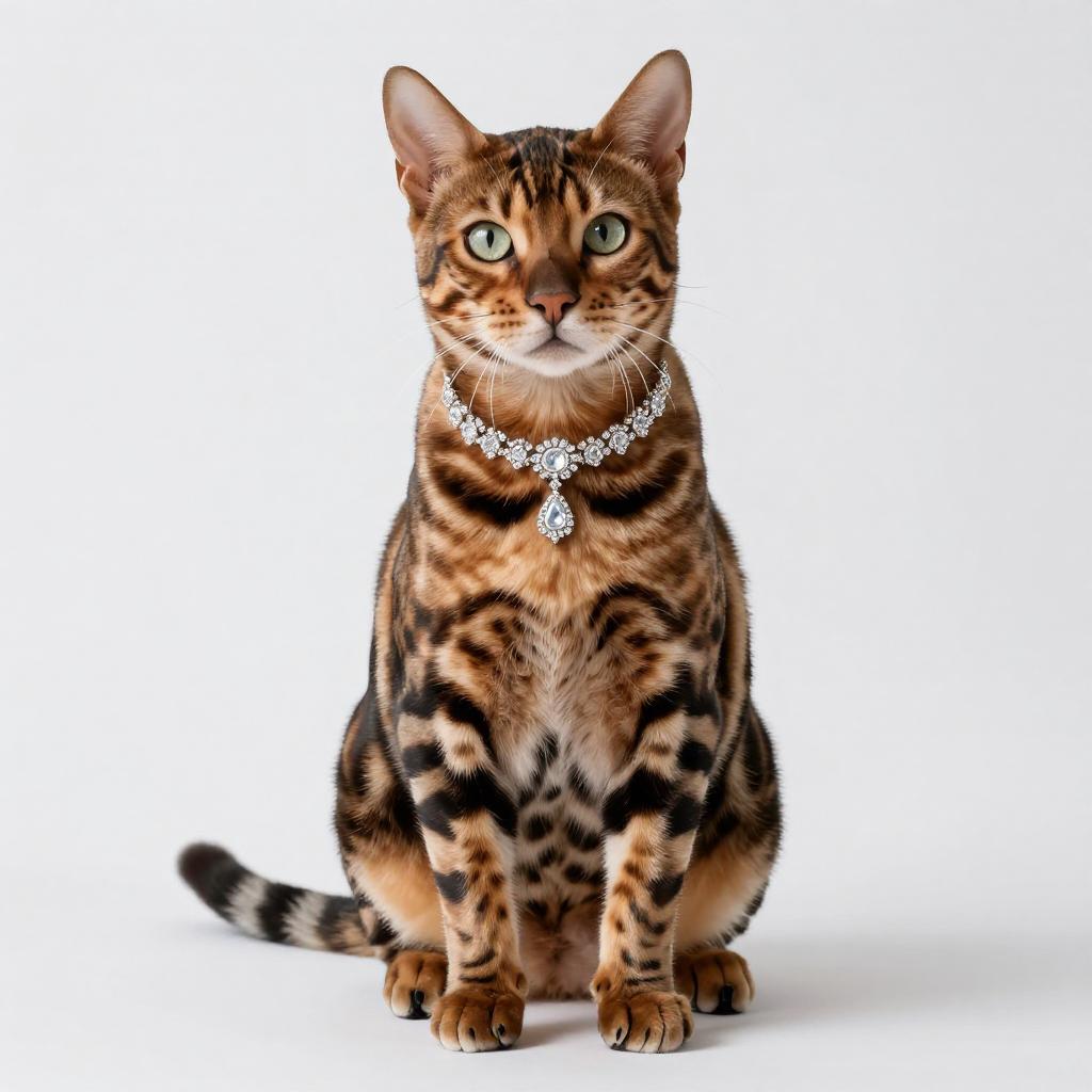 Luxurious studio portrait of a Bengal cat sitting upright, glossy dark fur, wearing an ornate sparkling diamond necklace, clean white background, high-end fashion pet photography, high resolution, ultra-detailed