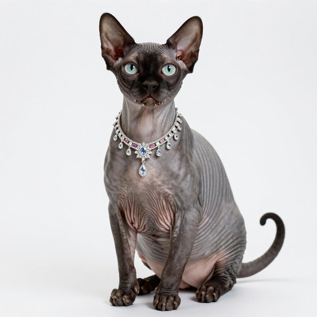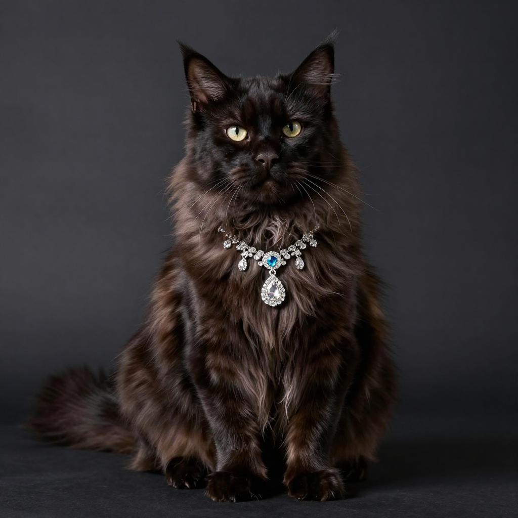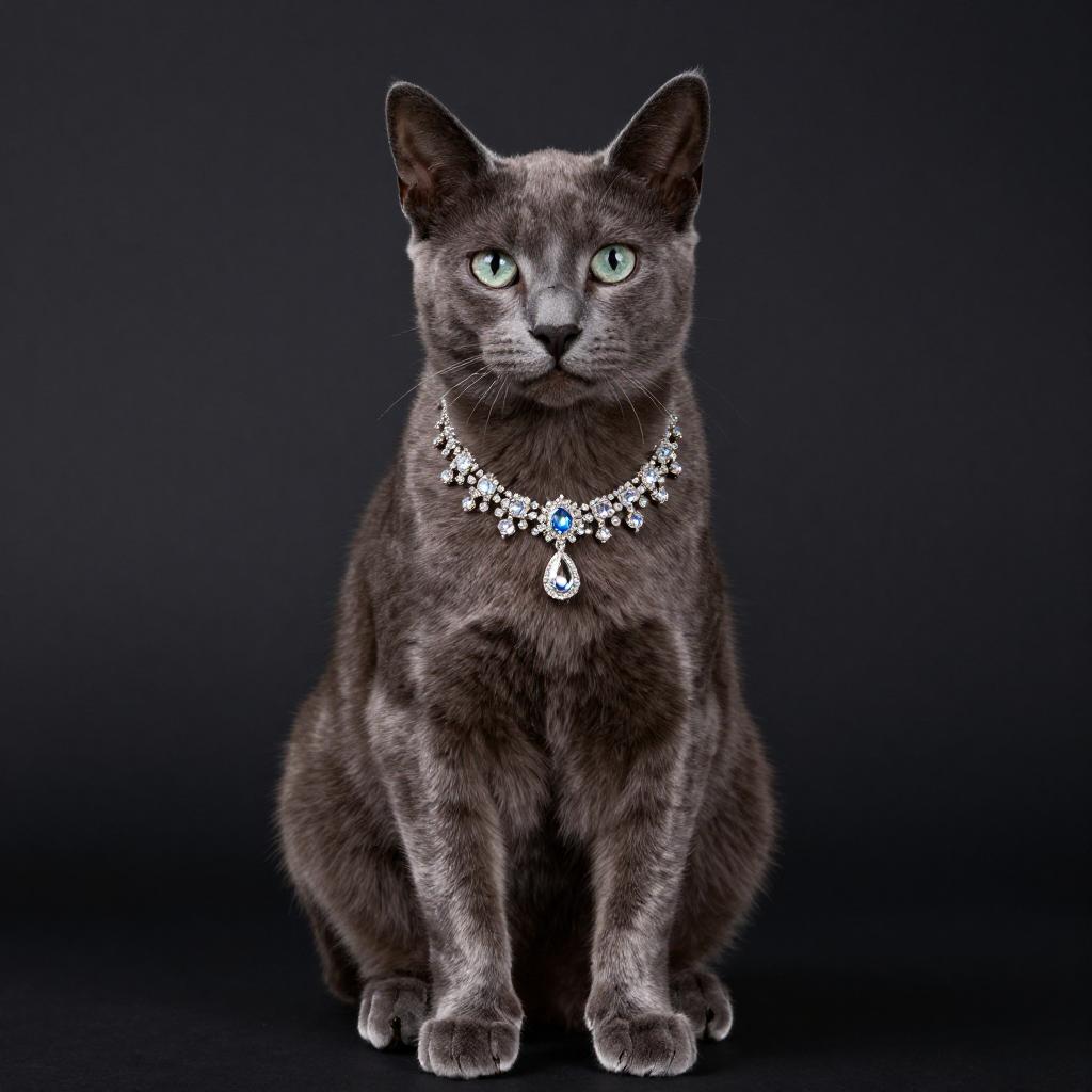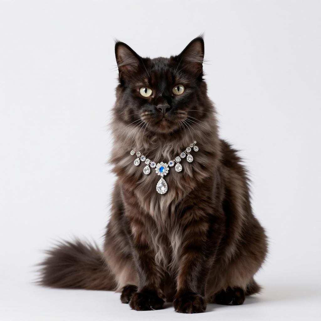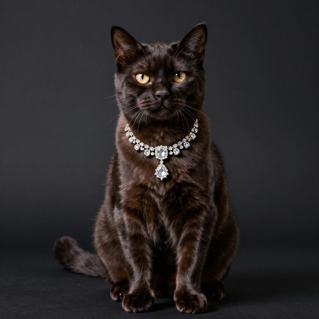 Luxurious studio portrait of a Bengal cat sitting upright, glossy dark fur, wearing an ornate sparkling diamond necklace, clean white background, high-end fashion pet photography, high resolution, ultra-detailed