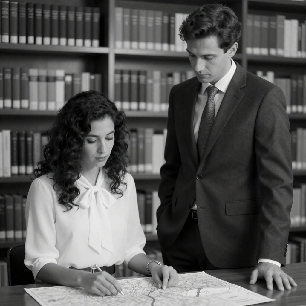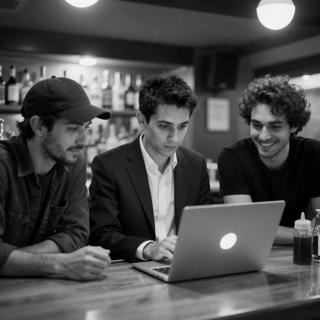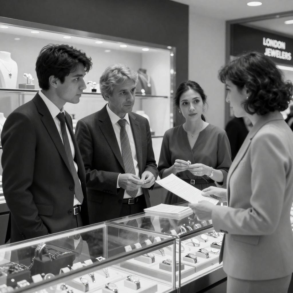 Black and white photograph of four people in a jewelry store. Three men and one woman stand behind glass displays. Two men in suits, one with dark hair and the other with lighter hair, and a woman with dark hair and a dress. Another woman in a light-colored suit holds papers. Displays of jewelry and watches on the counter. Background has shelves with more jewelry and a "London Jewelers" sign. Men interact with the woman in the dress, who holds a piece of jewelry. Casual, focused expressions.
