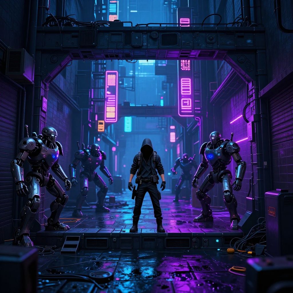 Cyberpunk side scroller environment, dark alley with flickering neon lights, robotic enemies and a hacker protagonist, gritty urban details, wet pavement reflections, intense blue and purple hues