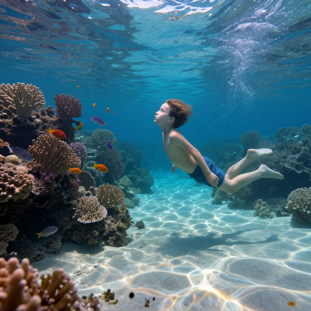 An image capturing an enchanting underwater scene, reminiscent of Stålenhag's fusion of surrealism and everyday life, portrays a solitary figure—a young boy with his head raised, eyes filled with awe—drifting elegantly amidst thriving coral reefs and darting schools of fish. The water surrounding him glistens with ethereal light, casting elongated, kaleidoscopic reflections onto the soft sand below, creating an alluring blend of realism and fantasy that evokes a sense of wonder and curiosity as we observe this tranquil moment in an extraordinary aquatic realm.