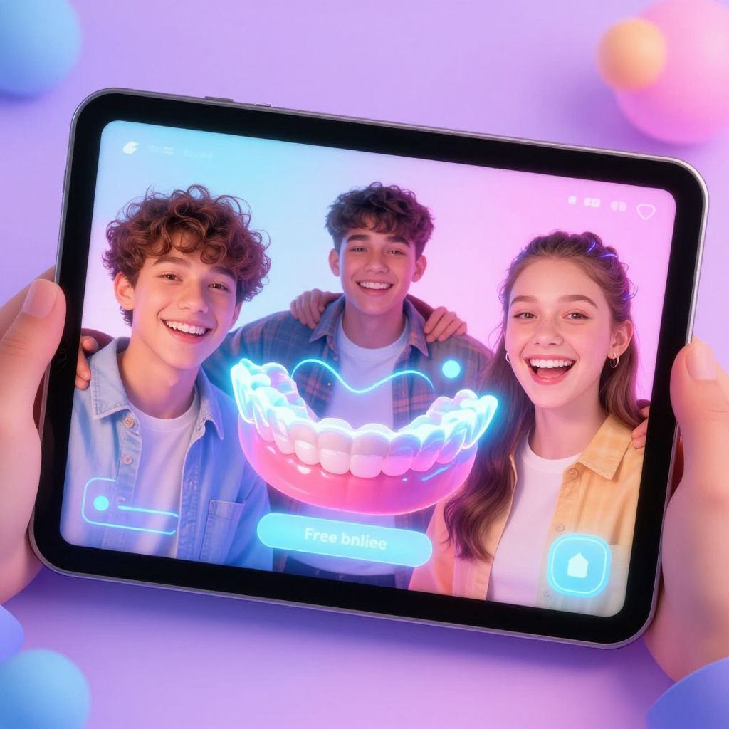 Free braces filter online, creative digital art showing a tablet displaying smiling teens with virtual braces, neon highlights, user-friendly design elements, lively atmosphere, pastel colors blending with dynamic tech visuals