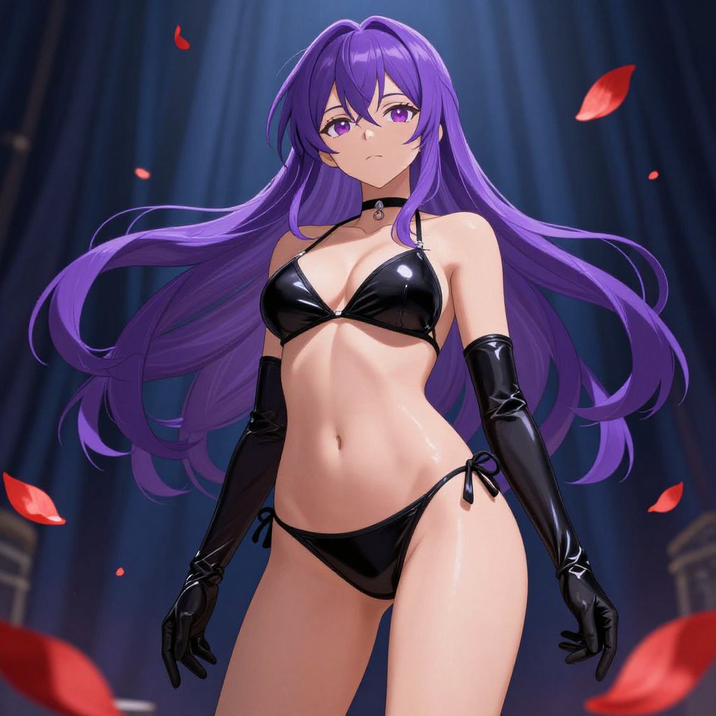 Digital anime-style illustration of a female character with long purple hair, wearing a black and white outfit, including a black top and white shorts, paired with black thigh-high boots. The character is posed against a backdrop featuring a large, glowing full moon and a starry night sky.