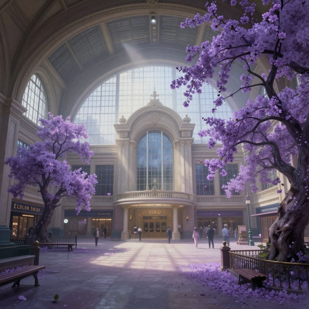 Photorealistic digital art: grand, sunlit arched glass ceiling, lilac cherry blossom trees, benches, people walking, elegant architectural details,