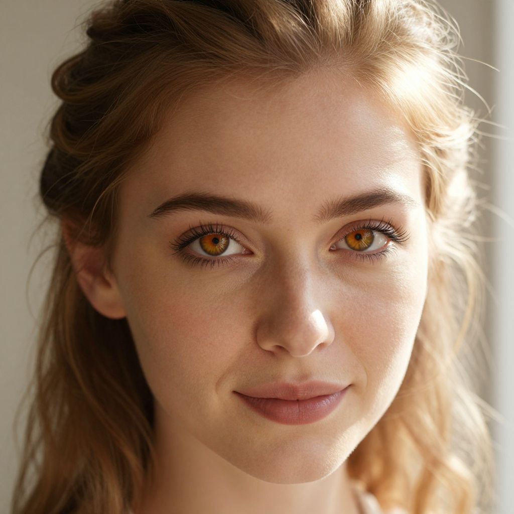 Close-up portrait of a young Eastern European woman with captivating amber eyes, long lashes, and delicately arched eyebrows. Her serene expression features a faint smile and subtle freckles, illuminated by soft natural light highlighting her flawless complexion. Golden hair styled elegantly with sunlight reflecting its luminescence, captured from a slightly elevated viewpoint.