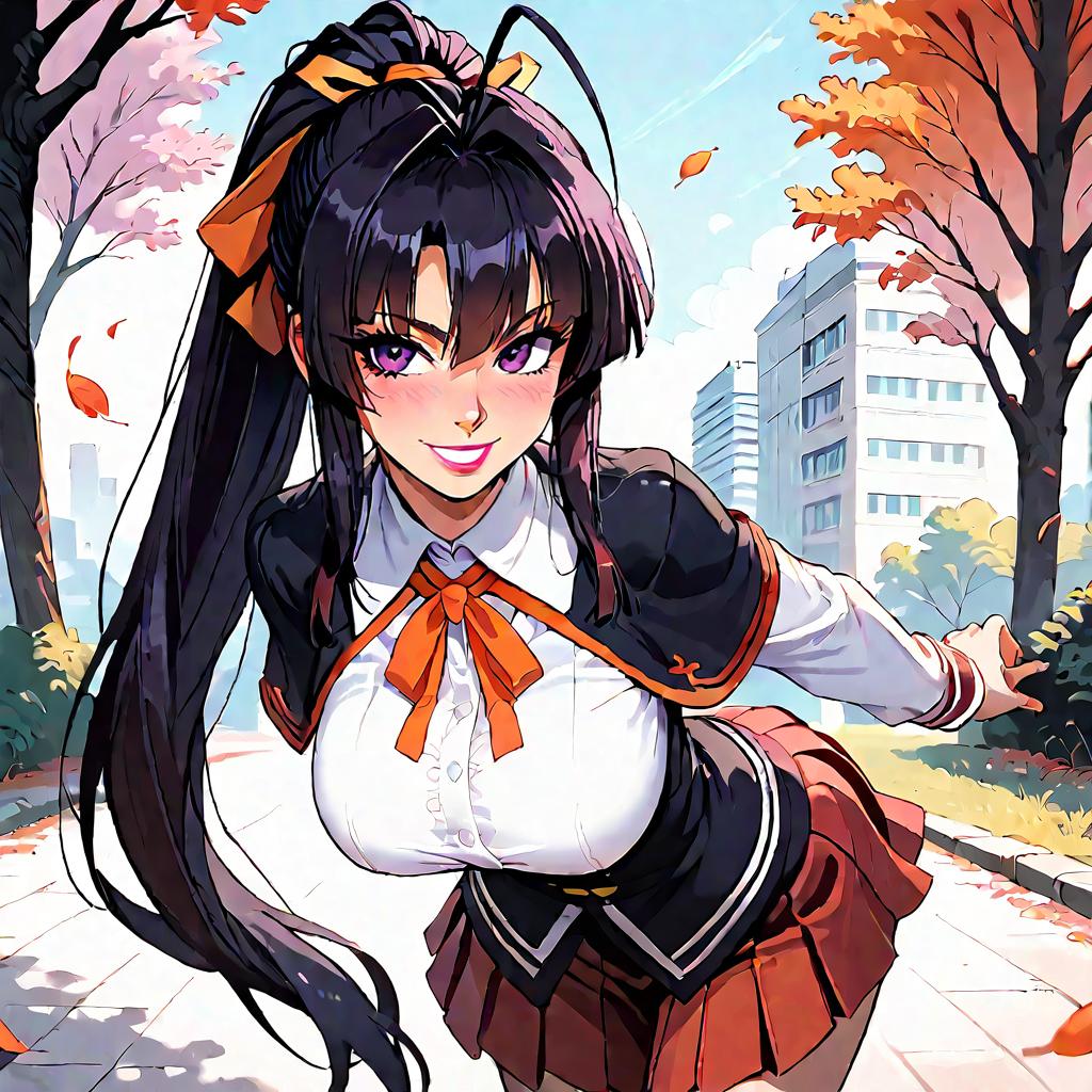 1girl, solo, cowboy shot, field, sky, sunlight, serious, fighting stance, large breasts, vg_yuuka, brown eyes, brown hair, long hair, high ponytail, hair ribbon, red ribbon, fingerless gloves, waitress, underbust, puffy short sleeves, white shirt, orange skirt, score_9, score_8_up, score_7_up, source_anime, best quality, masterpiece, uncensored