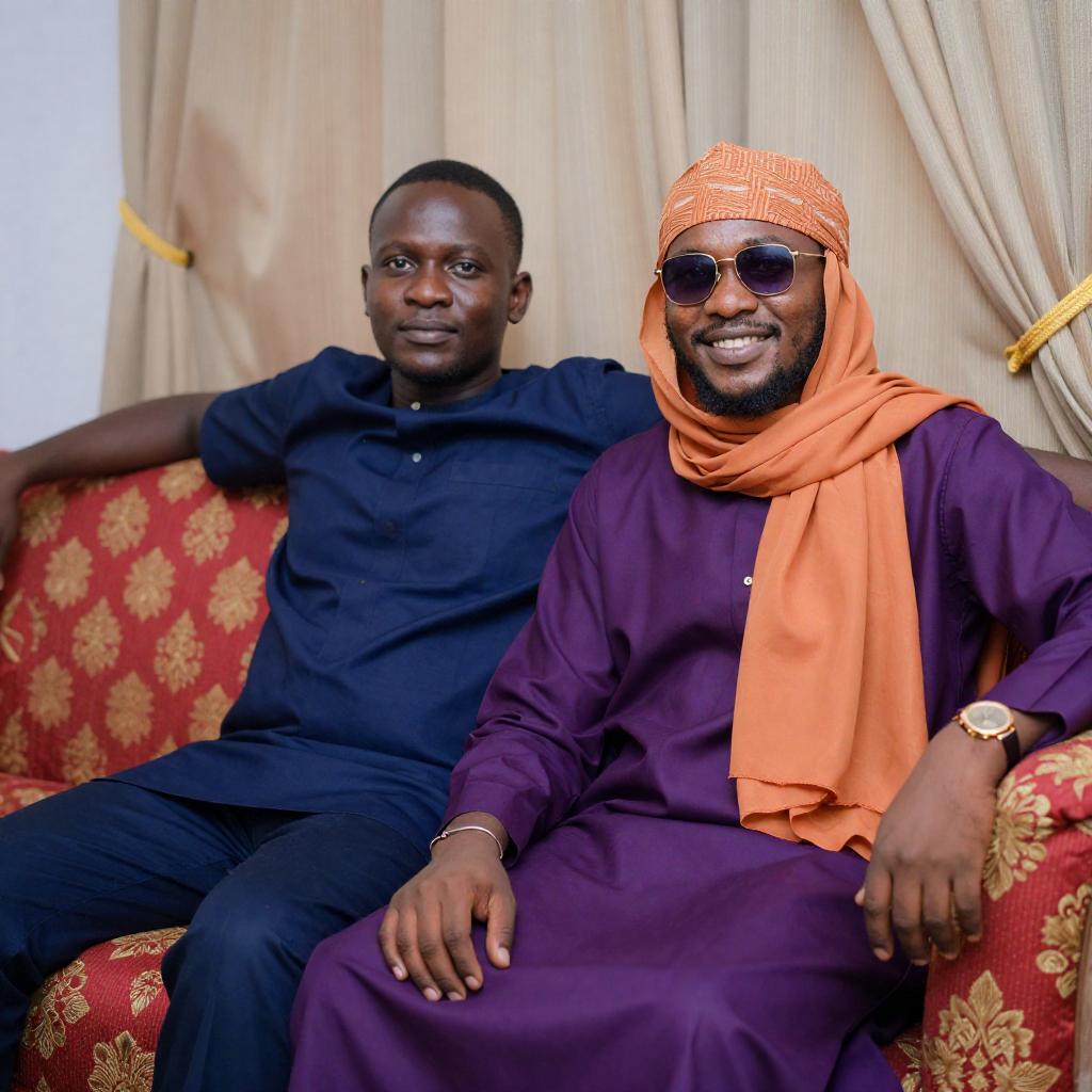 Portrait of two men with dark skin standing side by side. The man on the right has a large build, wearing a bright yellow long-sleeve shirt, glasses, a black cap, and a silver cross necklace, looking directly at the camera with an intense expression. The man on the left has a medium build, dressed in a checkered shirt, looking down with a neutral expression. The background features a large, partially visible face poster.