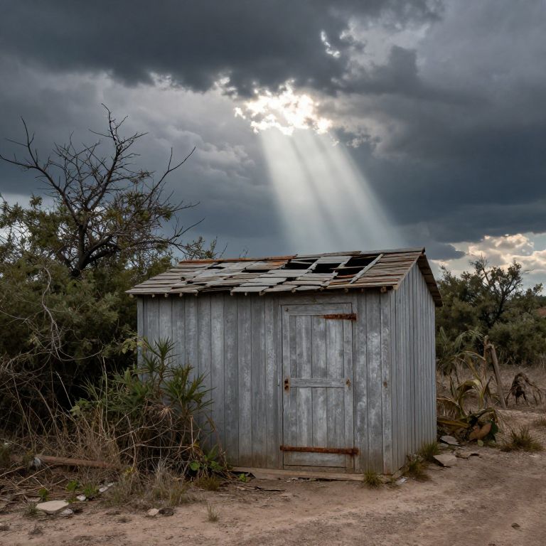 Rundown shed next to a dirt path under a stormy sky, broken roof tiles and rusty hinges, surrounded by wild shrubs and twisted trees, dramatic lighting with rays of sunlight piercing through dark clouds