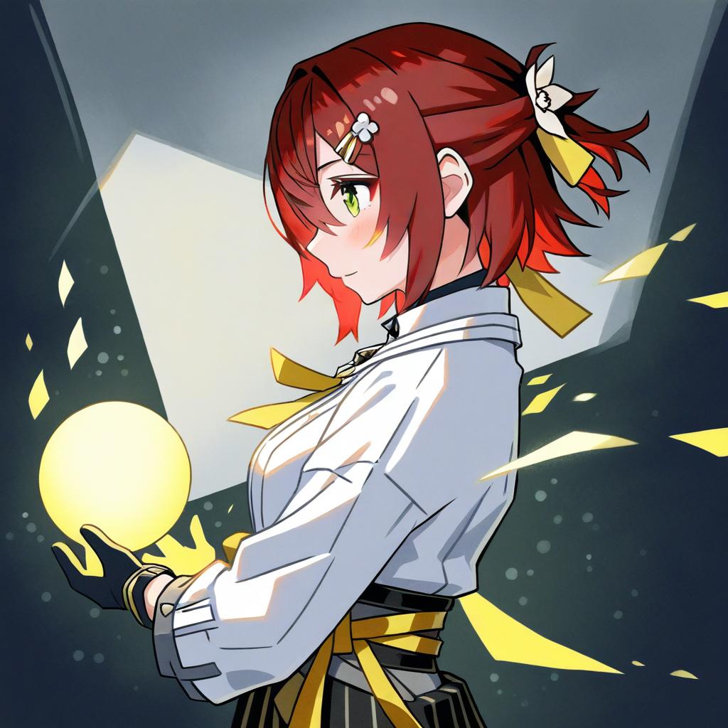 Hanasaki miyabi, holostars, 1boy, hair between eyes, yellow eyes, red hair, short hair, hair flower, hairclip, white shirt, long sleeves, yellow ribbon, virtual youtuber, virtual youtuber, half updo, by artist kawachi koorogi, animagine