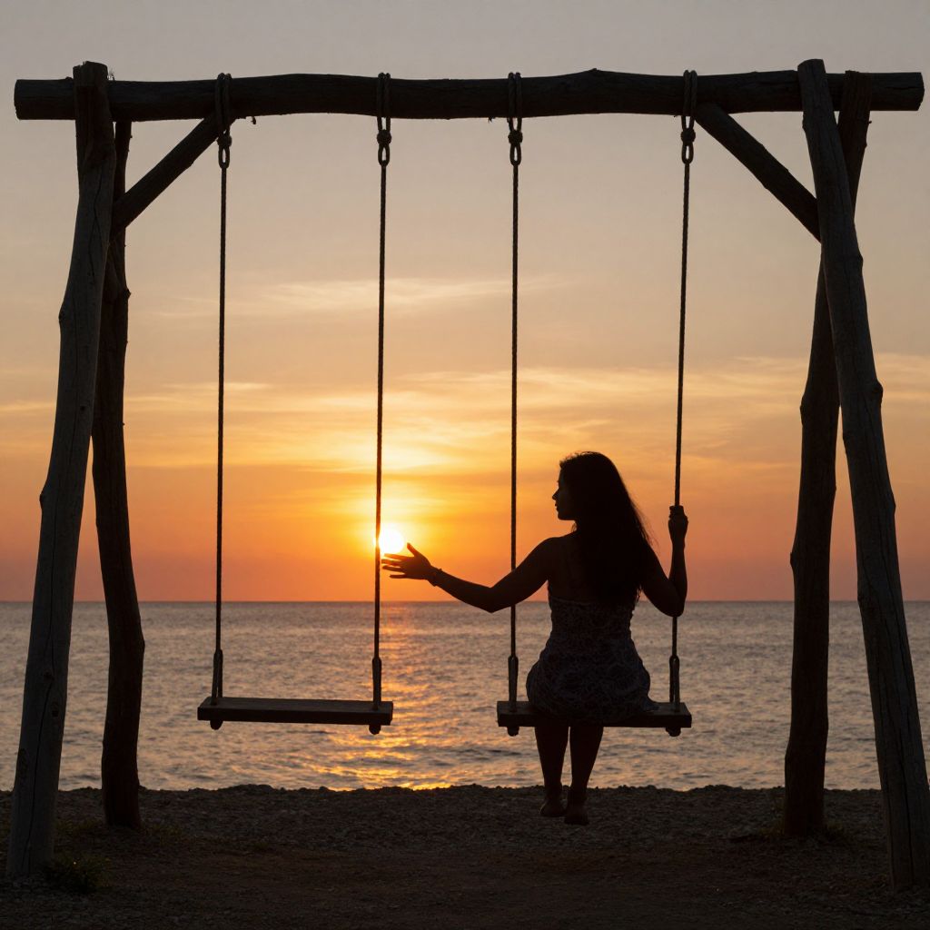 Silhouetted woman sitting on a wooden swing, her hands extended toward an empty seat, framed by a rustic wooden structure as the sun sets over the ocean, casting vibrant hues of orange and gold across the horizon.