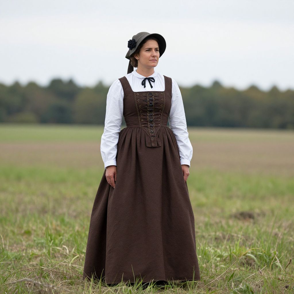 Colonial reenactment costume, woman in a brown and white dress and hat standing in a field