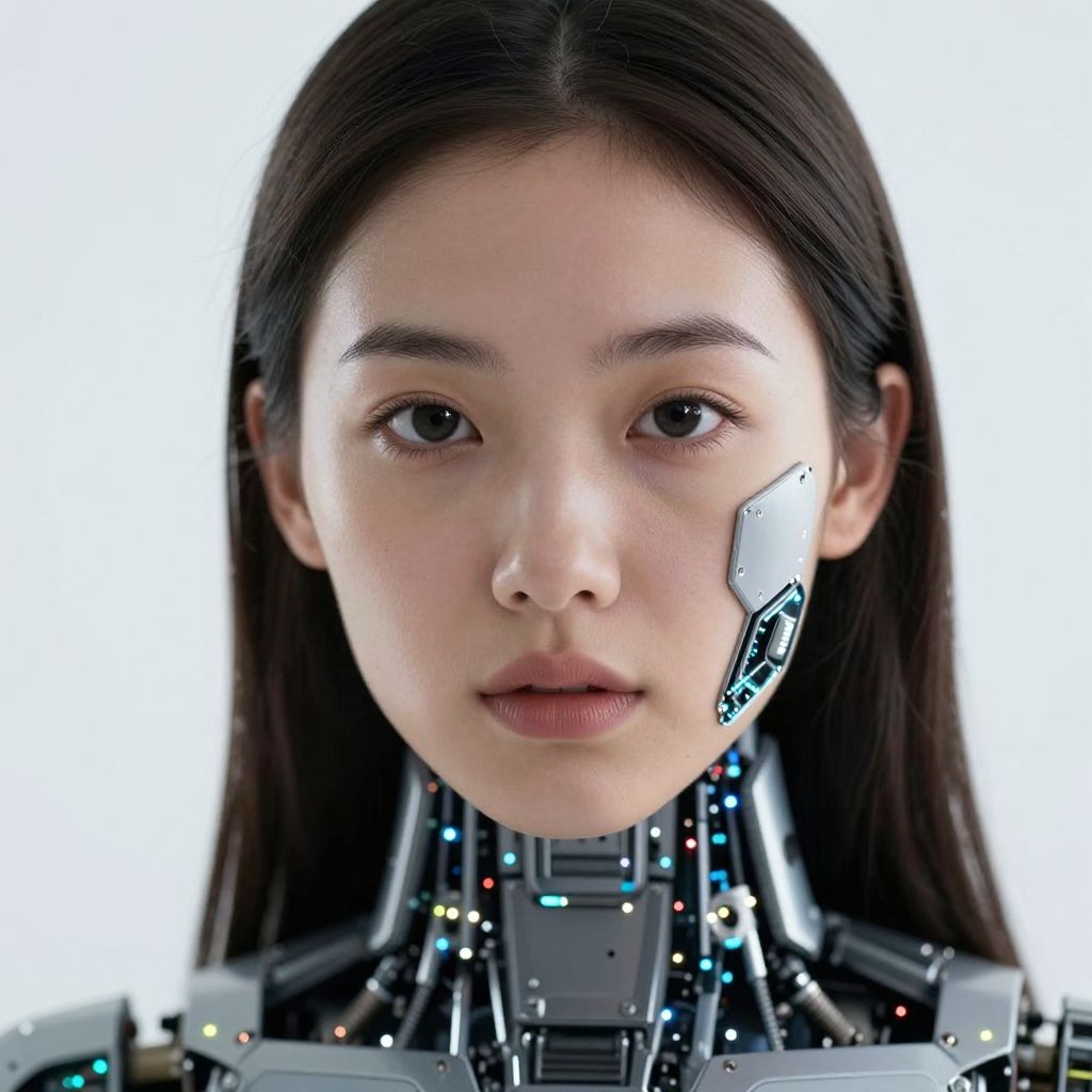 Photograph of an East Asian woman with long, straight black hair, fair skin, and large, dark eyes. She has a robotic, metallic prosthetic on her left cheek, extending down to her neck, adorned with small, colorful LED lights. Her expression is neutral, and she wears a high-tech, robotic armor with intricate mechanical components visible at the collarbone area. The background is a bright, white, and slightly overexposed, emphasizing the subject. The image has a futuristic, sci-fi aesthetic, blending human and robotic elements.