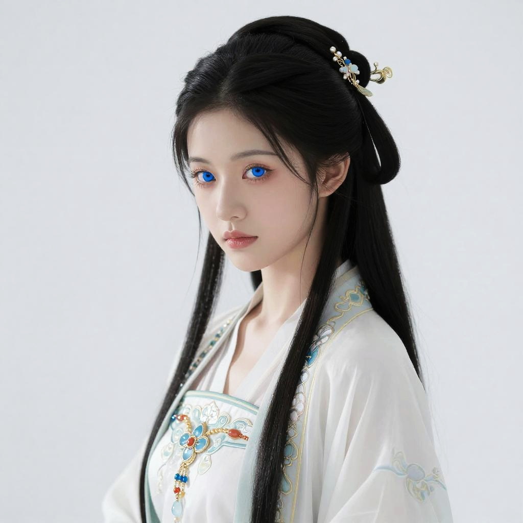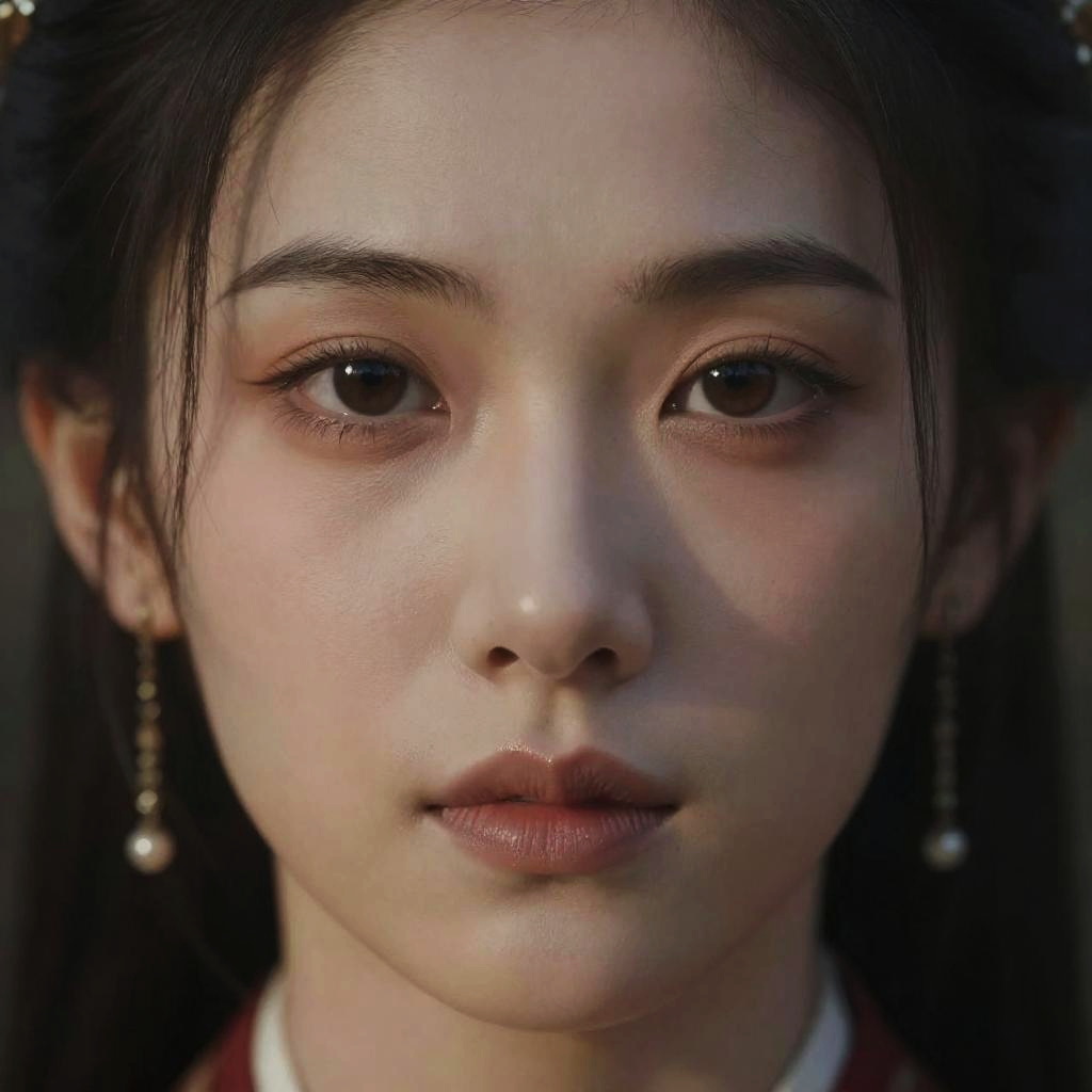 Photorealistic digital portrait of an Asian woman with fair skin, black hair, brown eyes, subtle smile, adorned with pearl and gold hairpins,
