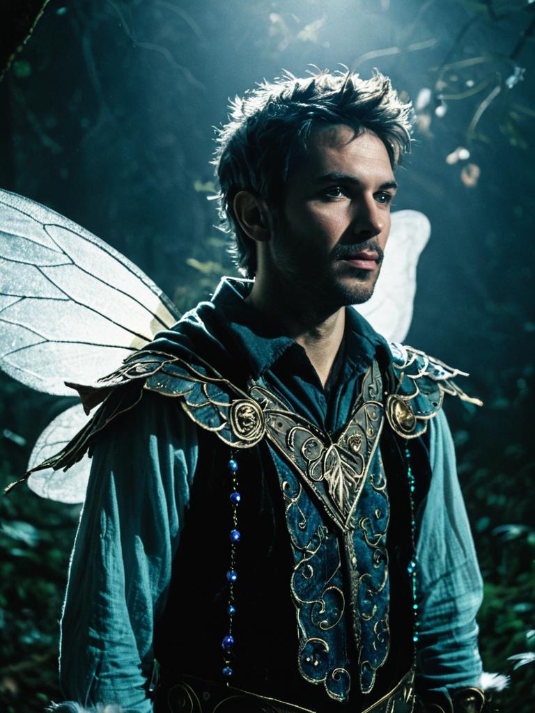 Man in Male Fairy costume, dramatic fantasy editorial lighting, enchanted costume detail