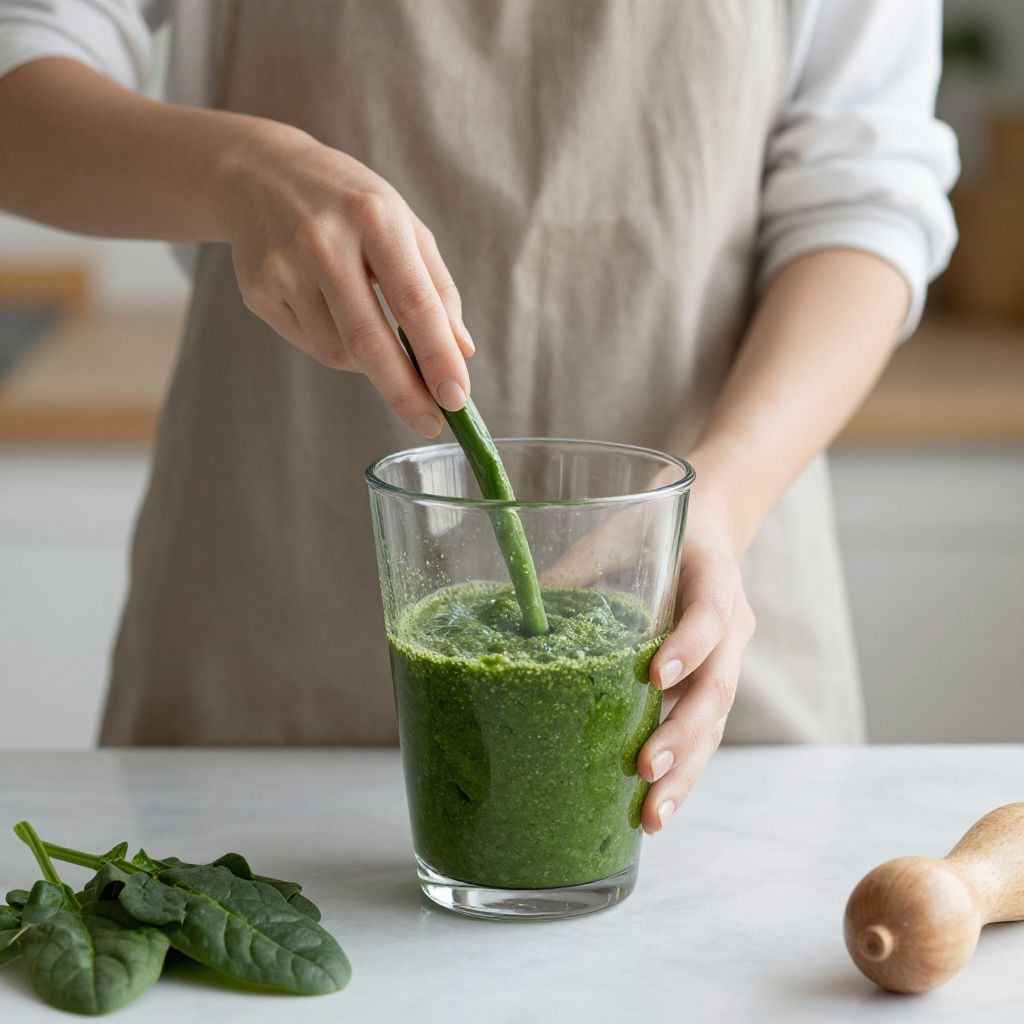 Photograph of a person blending green spinach in a clear glass, wearing a white shirt and gray apron, with fresh spinach leaves and a garlic bulb