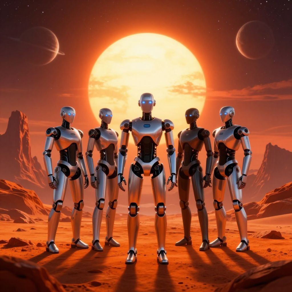 Digital artwork of five humanoid robots standing in a red desert landscape with a large sun, two planets, and rocky mountains. Bright, glowing, sci-fi
