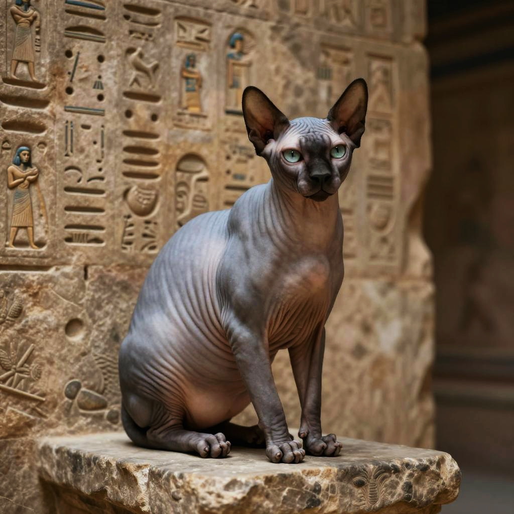 Buff sphynx cat sitting regally on an ancient stone pedestal, soft warm light highlighting its wrinkled skin and muscular form, intricate Egyptian hieroglyphics etched in the background, mystical atmosphere, ultra detailed, cinematic lighting