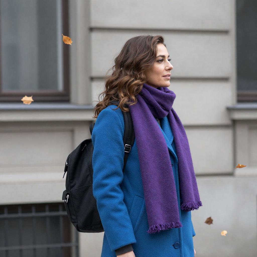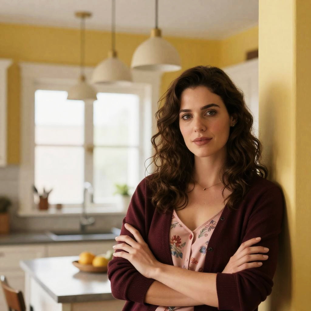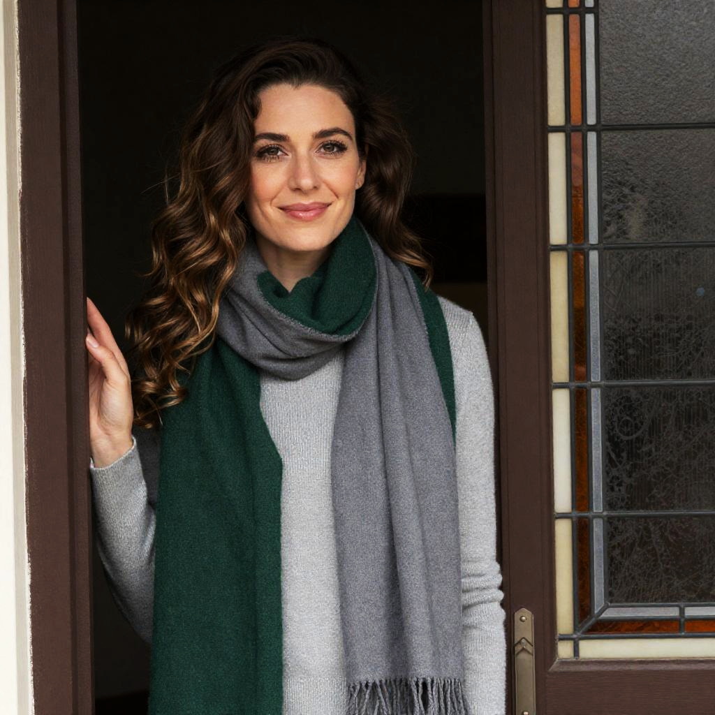 Woman with wavy brown hair, green and gray scarf, gray sweater, smiling, standing in doorway, stained glass window on right.