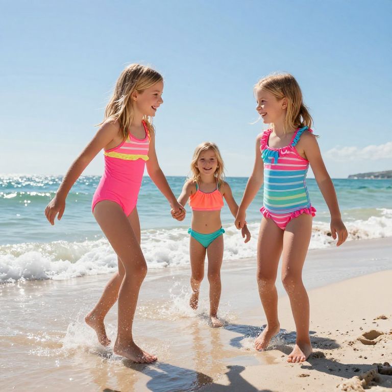 Little girls in small bikinis enjoying a tropical beach picnic under a large umbrella, with tropical fruits and colorful towels, bright and lively warm weather setting, candid joyful moment