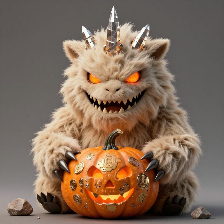 A photo of a large, fuzzy creature with glowing orange eyes and scary smile with very sharp teeth, The creature is holding a spherical pumpkin with various patterns, The object appears to be made of a metallic or electronic material, The creature's fur is a light beige or cream color, and it has sharp, pointed crystal unicorn horns on its head, The background is a muted gray, and there are small rocks scattered around the creature's feet