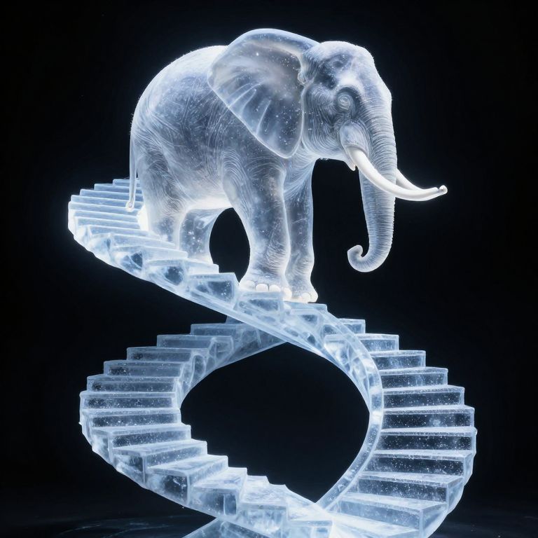 A translucent elephant made entirely of captured starlight lazily unwinds a spiraling staircase of frozen time into the air.