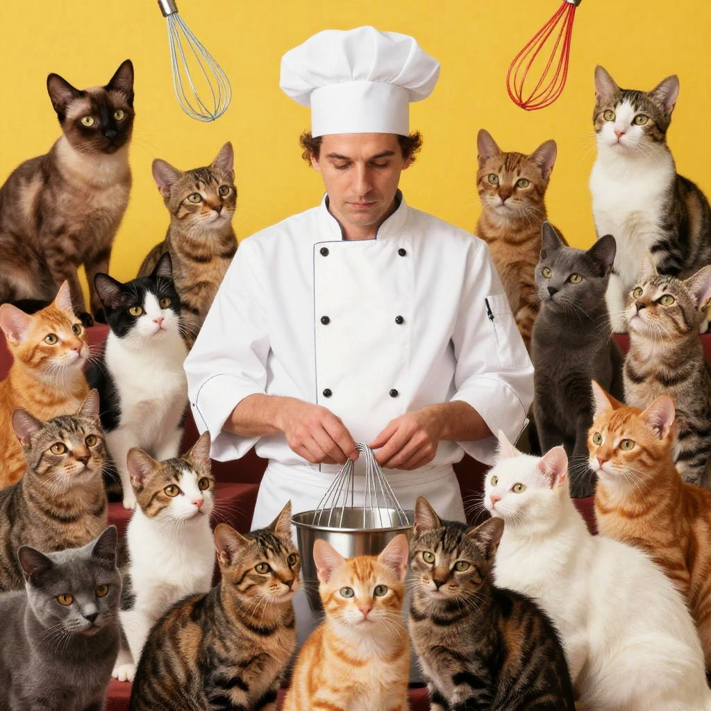 A chef surrounded by an unreasonable amount of whiskered lively kittens, in vivid psychedelic colors. Inspired by Arthur Frank Mathews, Alisa Burke, Anna Silivonchik, and Bill Bell.