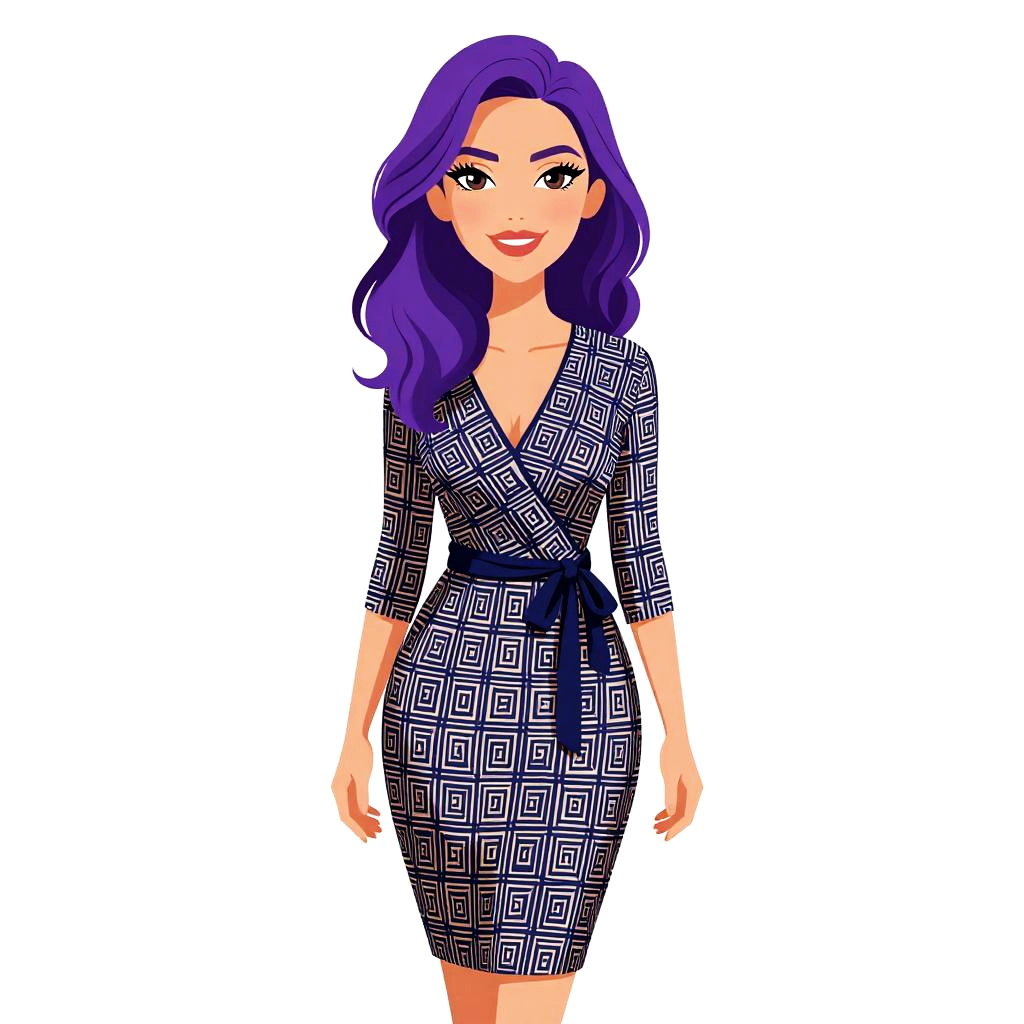 Digital illustration of a smiling woman with purple hair, wearing a navy blue polka dot dress, short sleeves, and a gold necklace, standing against a