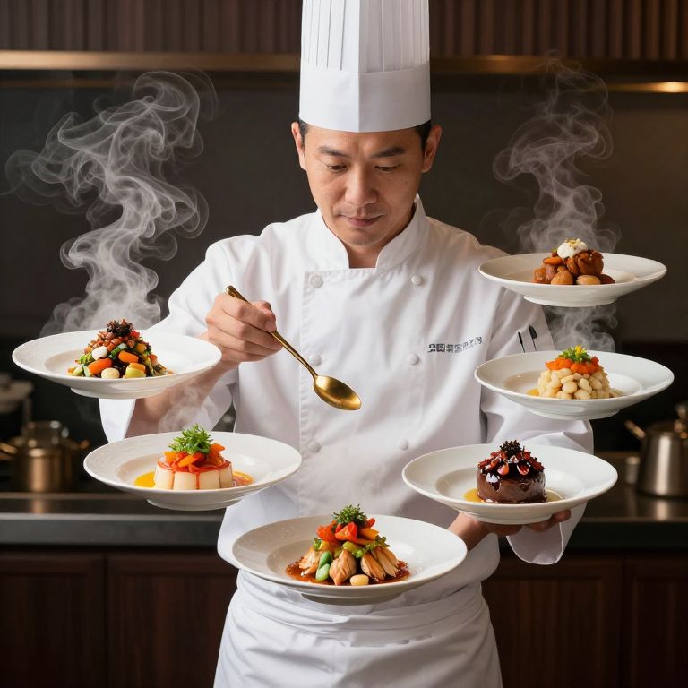 Chef in pristine white attire stands amidst swirling steam, presenting seven vibrant dishes suspended mid-air, each exuding warmth and aroma, while delicately garnishing one plate with a golden spoon.