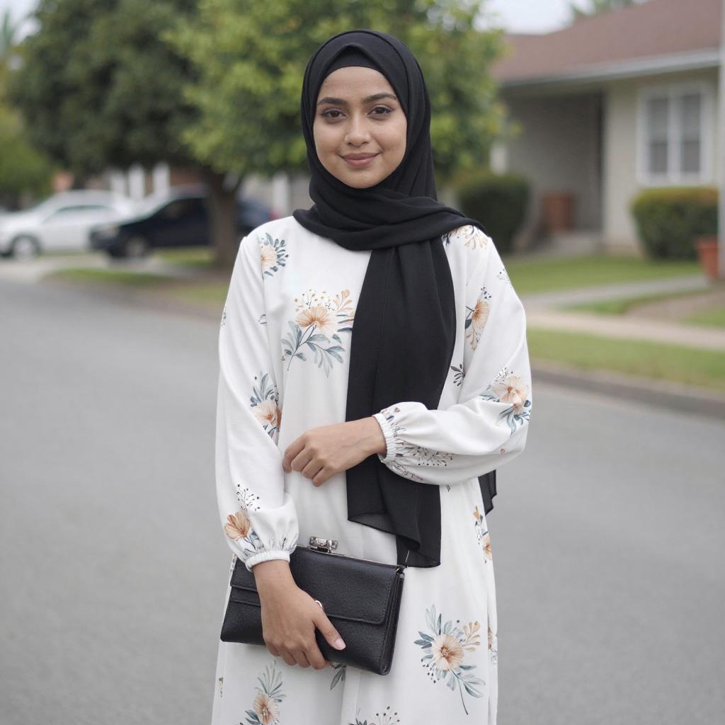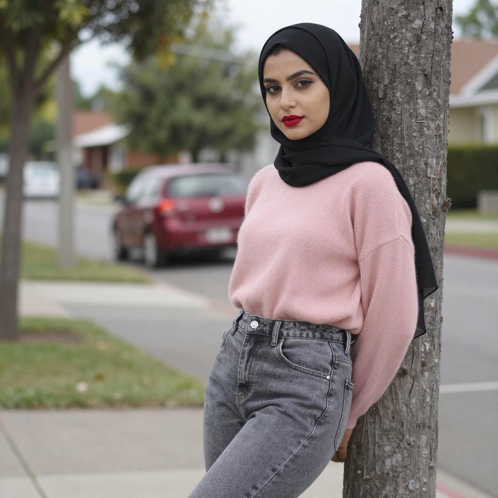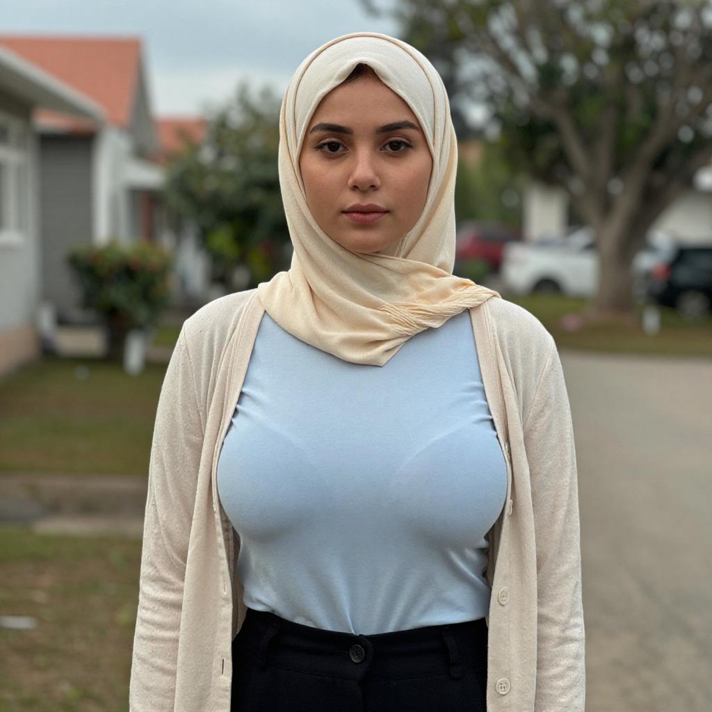 Photograph of a plus-sized woman with fair skin and dark hair, wearing a bright red hijab and long-sleeved dress that accentuates her large breasts. She stands on a suburban street with green grass, palm trees, and mountains in the background. Her expression is calm, and she looks slightly to the right.