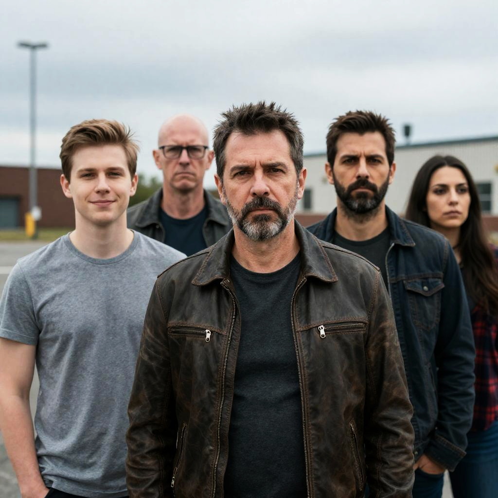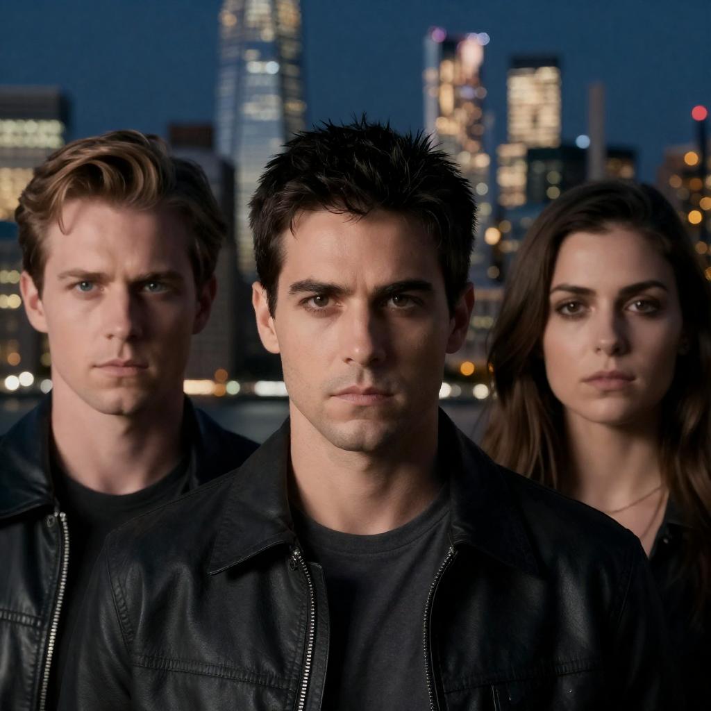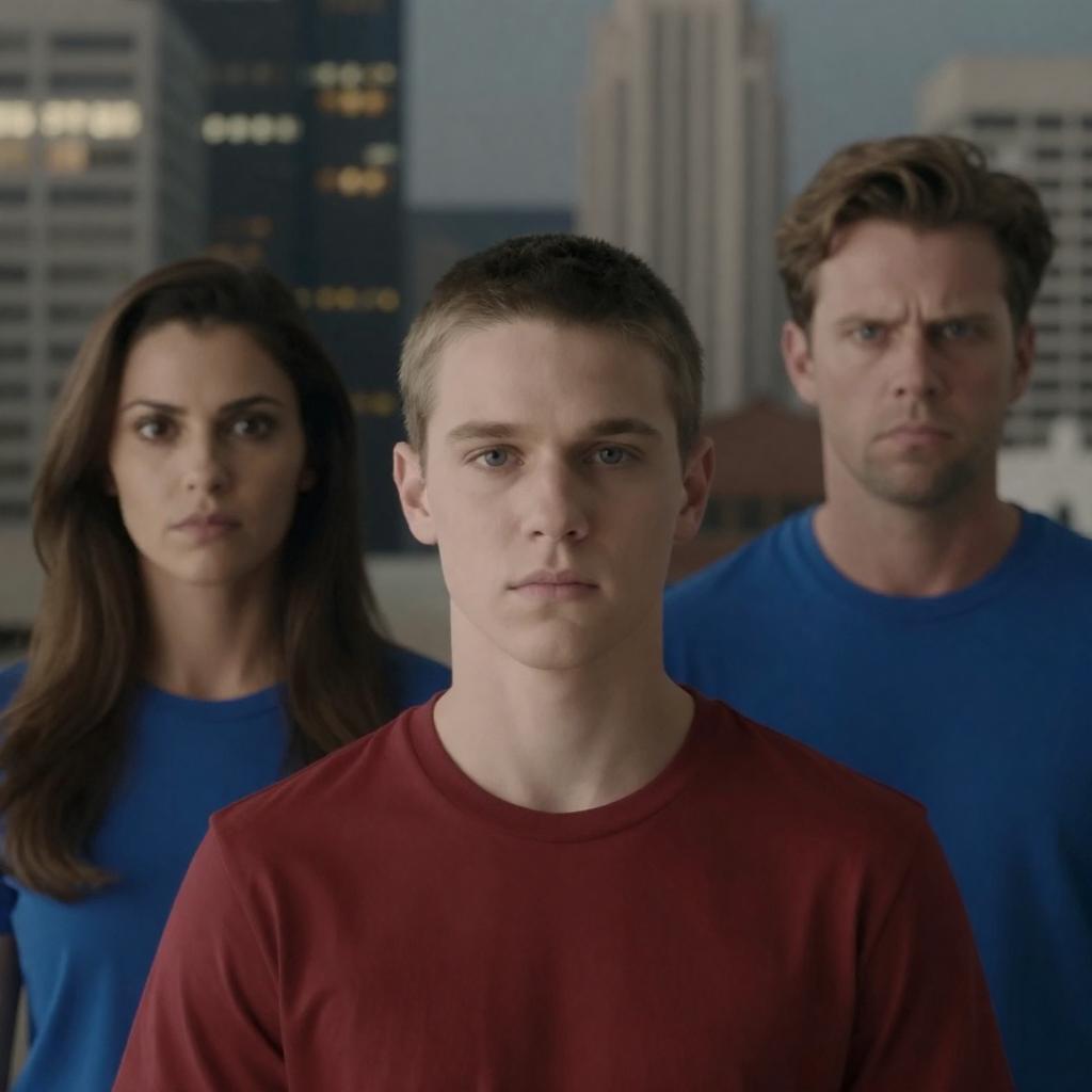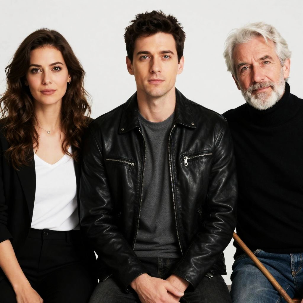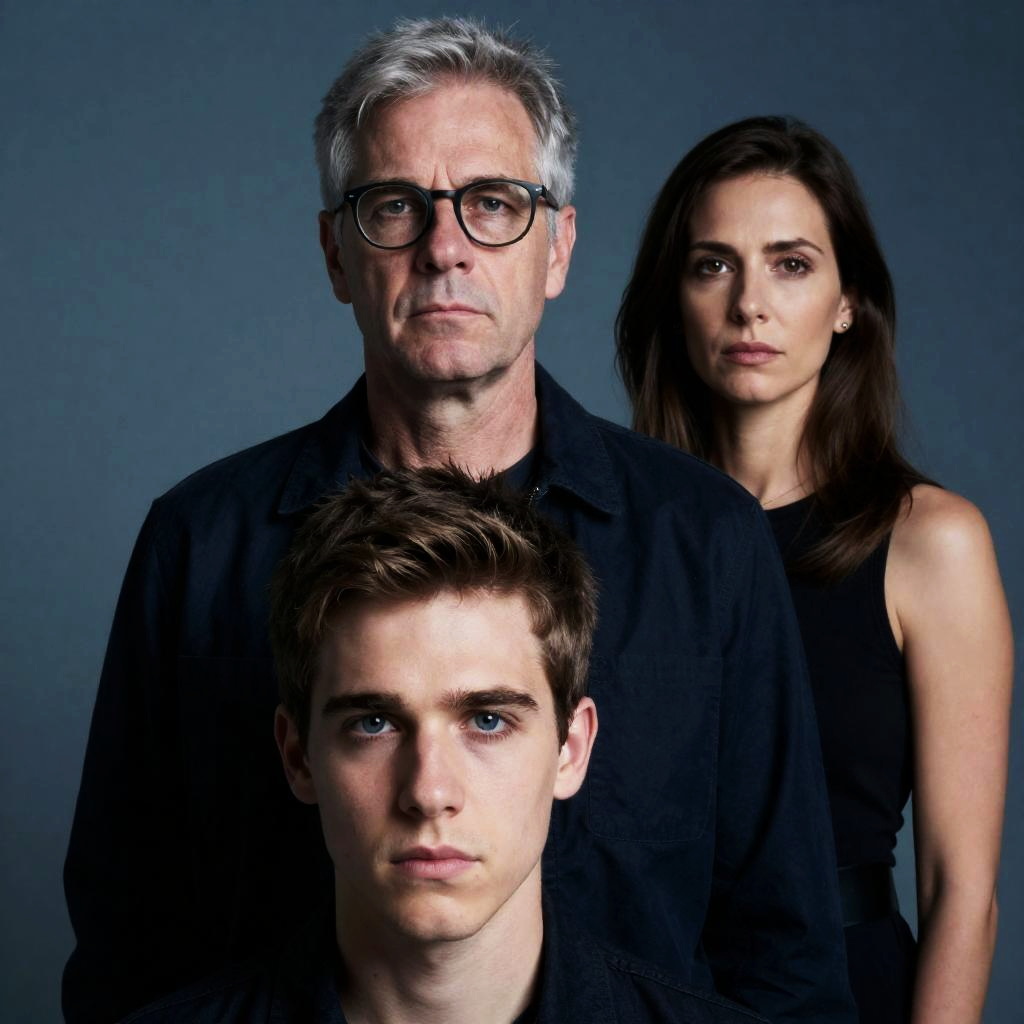 Photograph of three people against a blue gradient background. Foreground: young man with short brown hair, intense gaze, wearing dark shirt. Midground: older man with gray hair, glasses, serious expression, dark jacket. Background: woman with long brown hair, soft gaze, dark sleeveless top. Three people, strong contrasts in expressions and lighting.