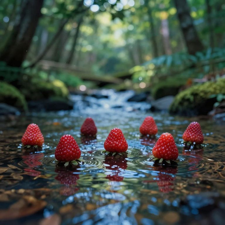 Photograph of a serene forest stream with seven vibrant red strawberries floating on the water's surface. The strawberries are detailed with small white dots, and their reflections shimmer in the clear stream. The background features a lush, green forest with blurred sunlight filtering through the trees, creating a peaceful, natural atmosphere. The water is shallow, showing pebbles and small rocks beneath. Moss-covered rocks line the stream's edges, enhancing the forest's rich, green palette. The image captures the contrast between the bright red strawberries and the tranquil, green forest.