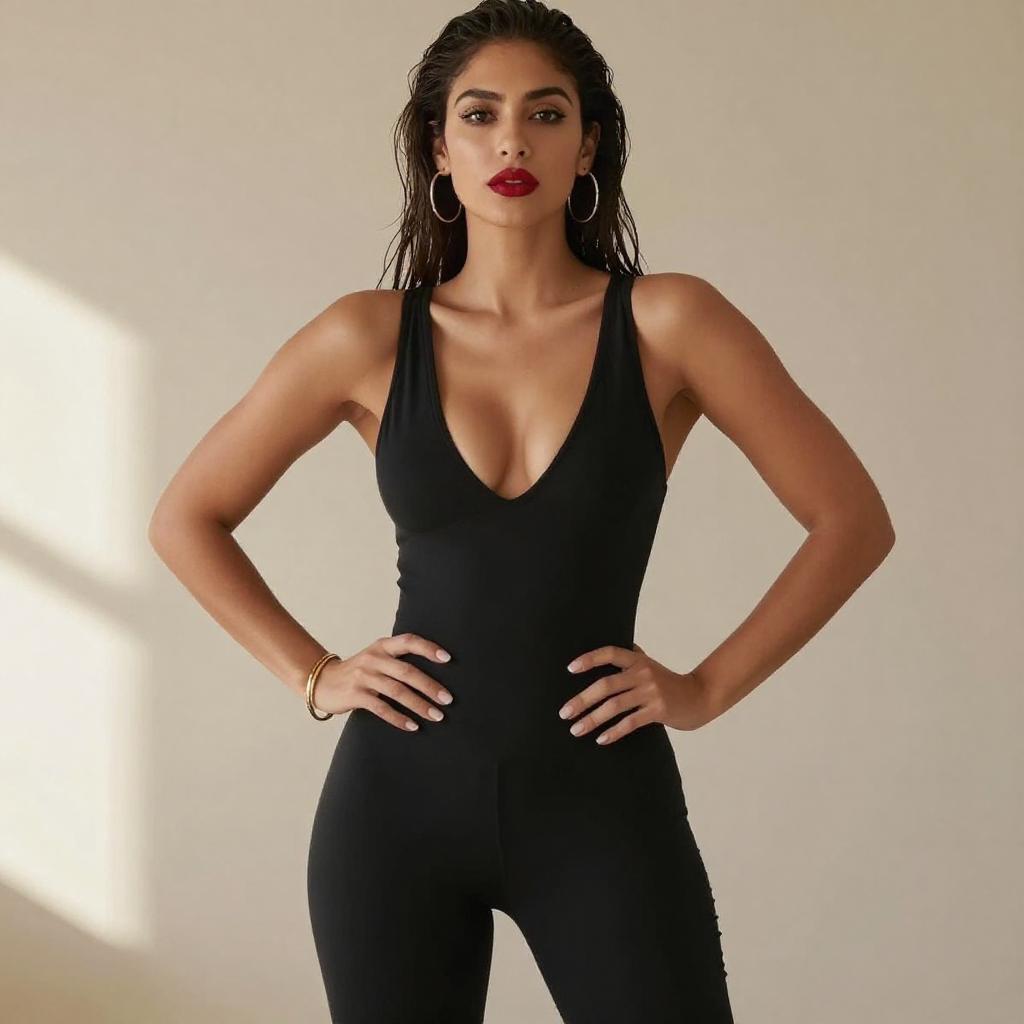 Photograph of a woman with long, wavy, light brown hair, wearing an off-shoulder, black, glittery crop top and matching black shorts. She stands in a dimly lit hallway with a patterned carpet and wooden floor. Her right hand rests on her hip, and she gazes slightly to the side with a subtle smile.