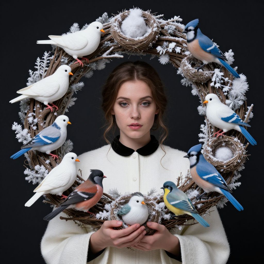 The image depicts a beautifully rendered portrait of a woman adorned with a winter wreath, symbolizing the season of winter. The wreath is intricately designed with a variety of winter birds and nests, each meticulously detailed and vibrant in color. The birds, including white doves and blue jays, are perched on the branches, creating a sense of harmony and balance. The woman's attire is a white robe, complemented by a black collar, adding a touch of elegance and contrast to the scene. Her hands gently hold a small bird, further emphasizing the theme of winter. The background is dark, which highlights the subjects and the intricate details of the wreath, making them stand out prominently. The overall composition is balanced, with the wreath and the woman as the central focus, surrounded by the winter birds and nests, creating a serene and picturesque winter scene.