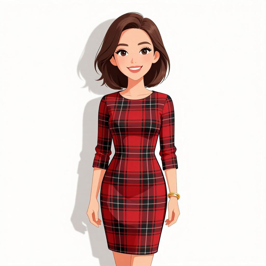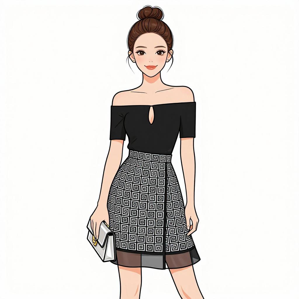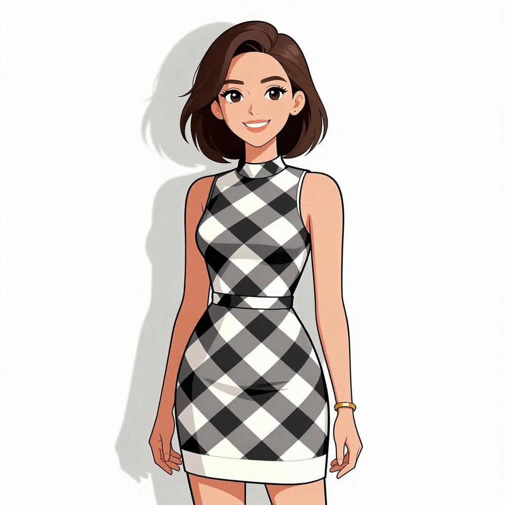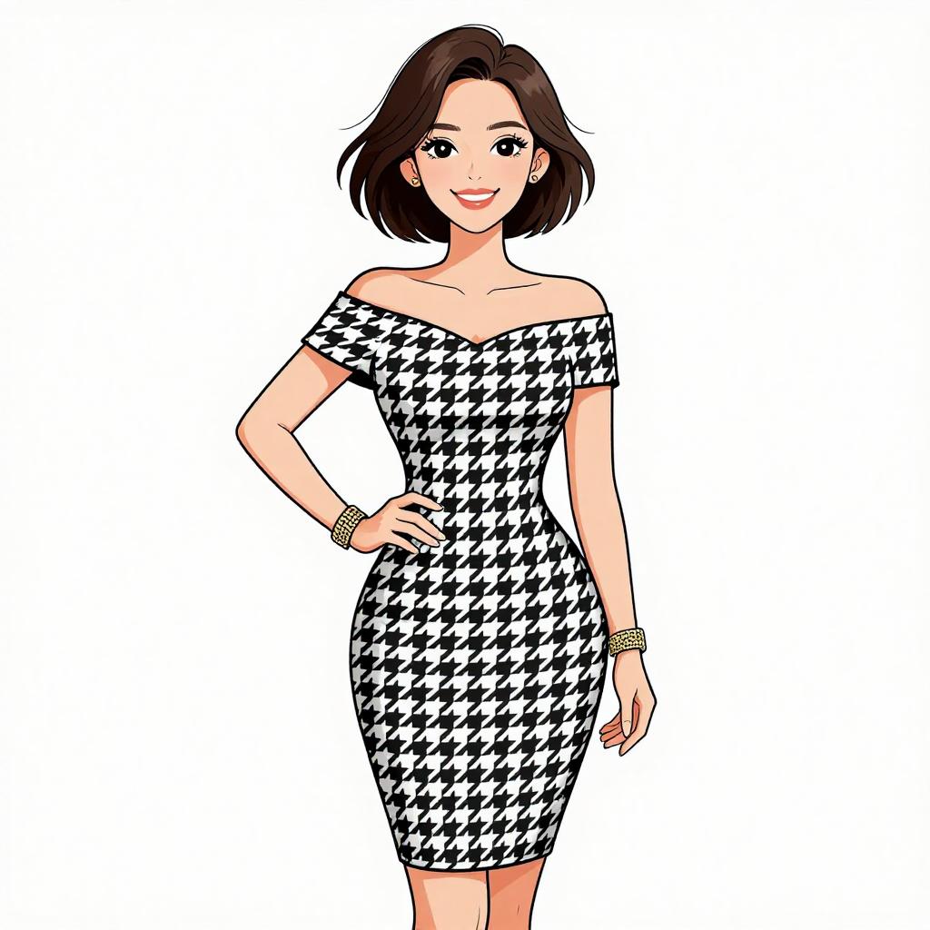 Woman with pretty face and pretty hair. smiling Woman, contemporary chic, off-the-shoulder sheath dress with black and white houndstooth pattern, short sleeves, thigh-length, fitted silhouette, gold mesh bracelet, tousled short hairstyle, white studio background. --sref 1467