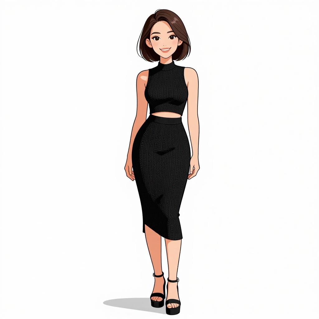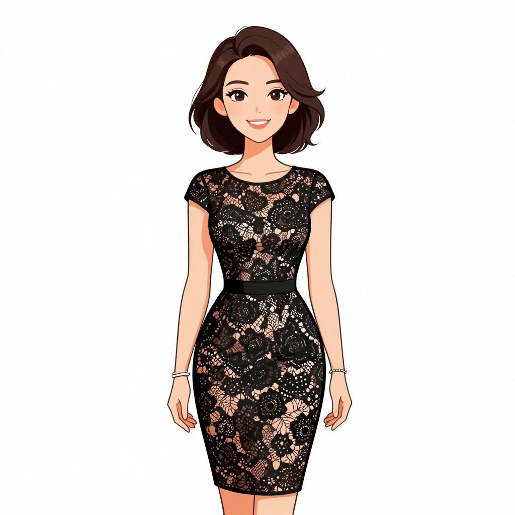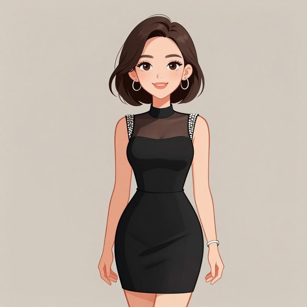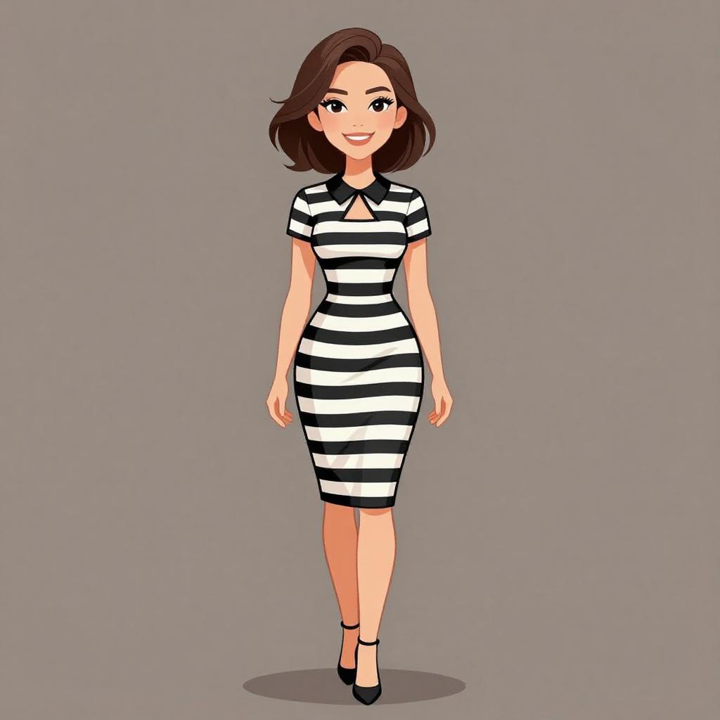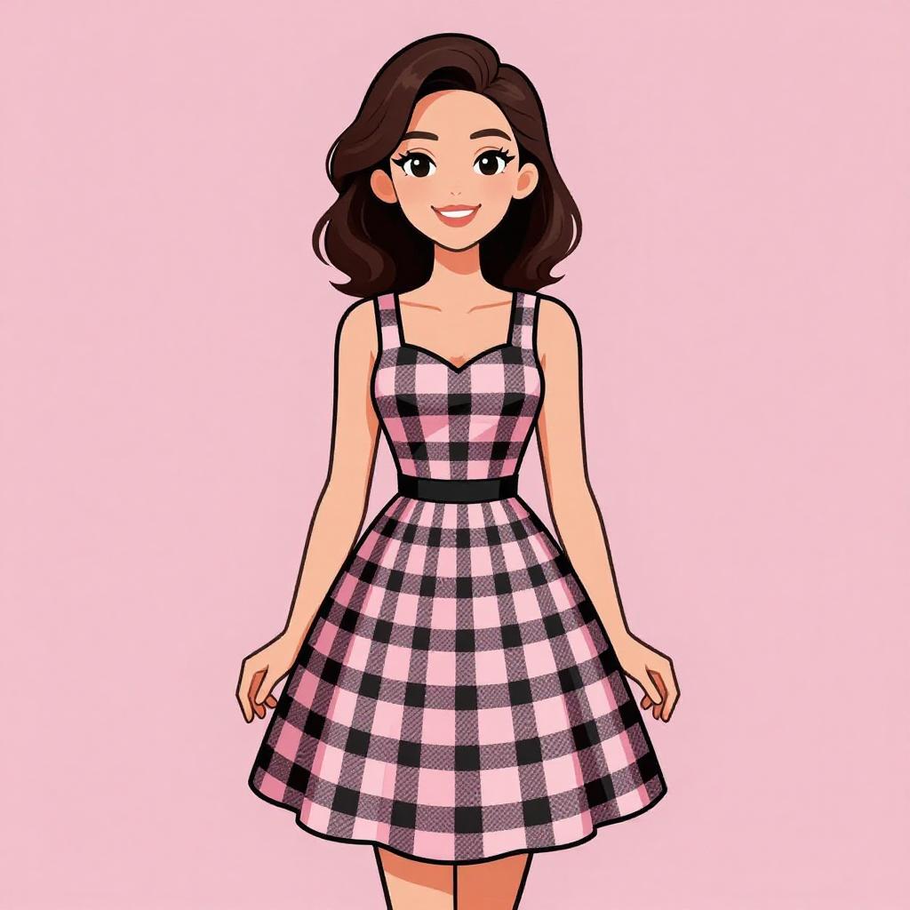 Woman with pretty face and pretty hair. smiling Woman, contemporary chic, off-the-shoulder sheath dress with black and white houndstooth pattern, short sleeves, thigh-length, fitted silhouette, gold mesh bracelet, tousled short hairstyle, white studio background. --sref 1467
