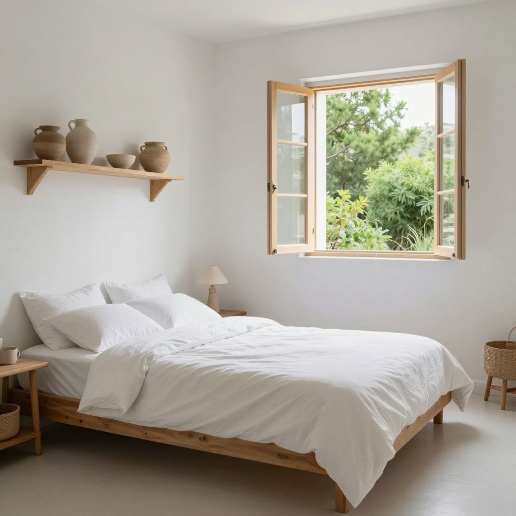 Minimalist cottagecore bedroom with a low wooden bed, airy white linens, handmade pottery on a wooden shelf, open windows showing lush greenery outside, tranquil and uncluttered space.