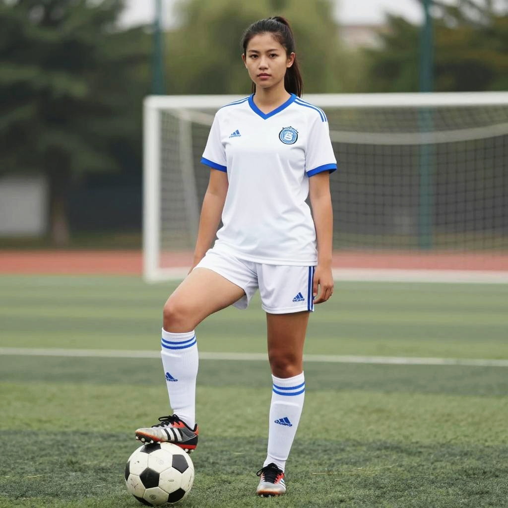 A confident young woman stands on a soccer field, wearing a white soccer uniform with blue accents. She is poised next to a soccer ball, embodying the spirit of athleticism and determination in a professional sports setting.