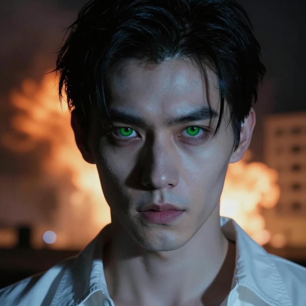 A young man with pale skin, dark brown hair, and green eyes. He wears a white shirt, looking slightly to the side with a serious expression. A large knife with a wooden handle rests on his right shoulder. Soft yellow light in the background. One visible light source on the right.