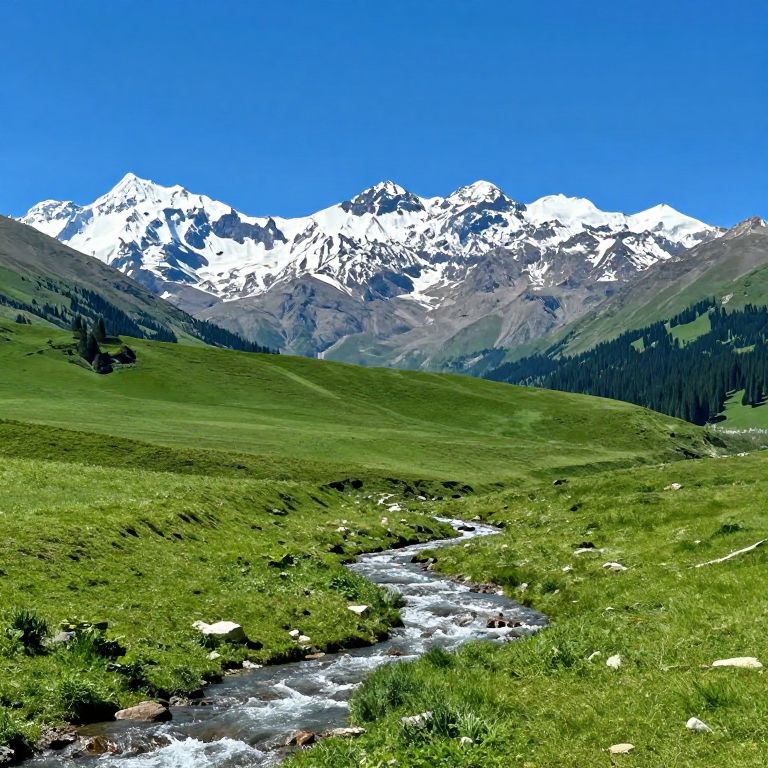Photograph of a vibrant mountain landscape. In the foreground, a lush green meadow with a small, clear stream winding through it. Mid-ground features rolling hills covered in dense green grass. The background showcases a range of towering, snow-capped mountains under a vivid blue sky. The mountains have jagged peaks and rocky textures. Dark green pine trees are scattered on the lower slopes of the mountains. The overall scene is bright and colorful, with strong contrasts between the green meadow, white snow, and blue sky.