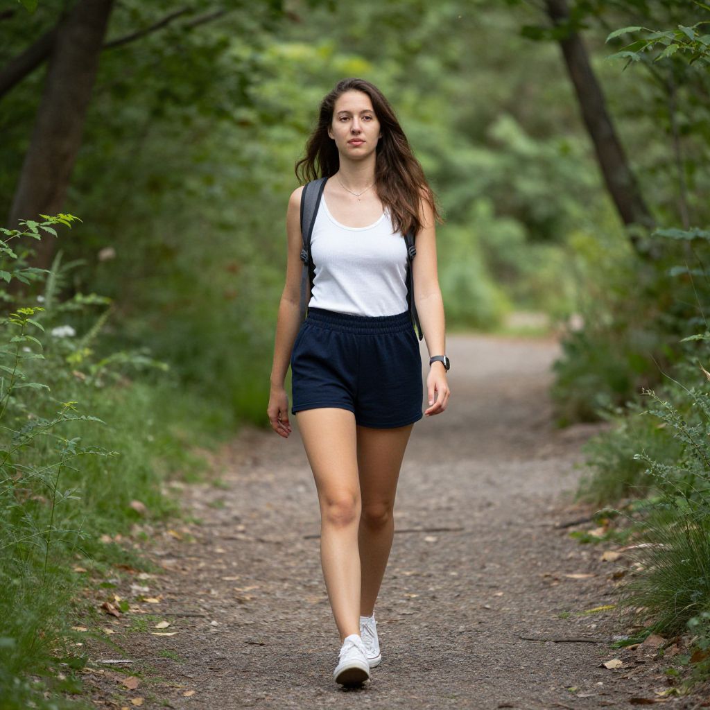 Photograph of a young woman with long brown hair, wearing a white tank top, black shorts, and white sneakers, walking on a forest path surrounded
