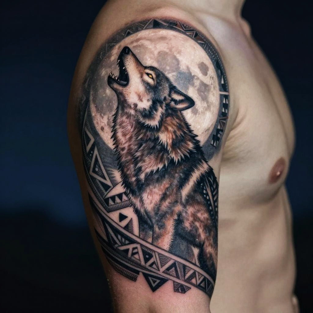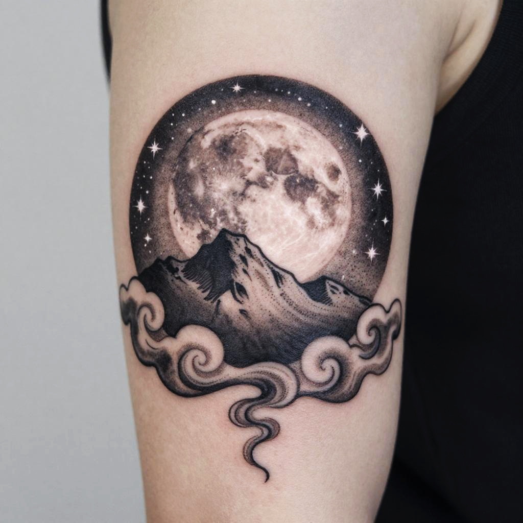 Moon scene tattoo with a glowing full moon over silhouetted mountains, intricate dotwork stars, and delicate swirling clouds, in black and grey ink style.