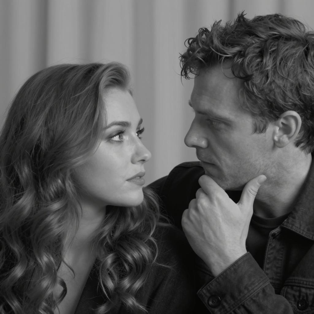 Red-haired woman with large gold earrings and white hairband faces a man with brown hair and leather jacket, holding a microphone close to her face. Background shows blurred people. Man looks intently at her. Both have serious expressions. Man wears a black shirt under jacket. Number of people: 3.